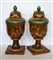 Le anfore si presentano a corpo pieno, con pareti tornite ornate a graffiti astratti ed intarsio a losanghe, coperchio con pomello a ghianda e piede circolare su base quadrata.