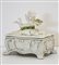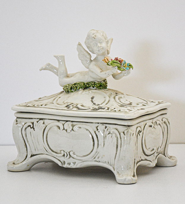 Scatola in porcellana bianca con putto, decorazioni floreali dipinte a mano.