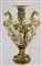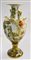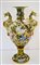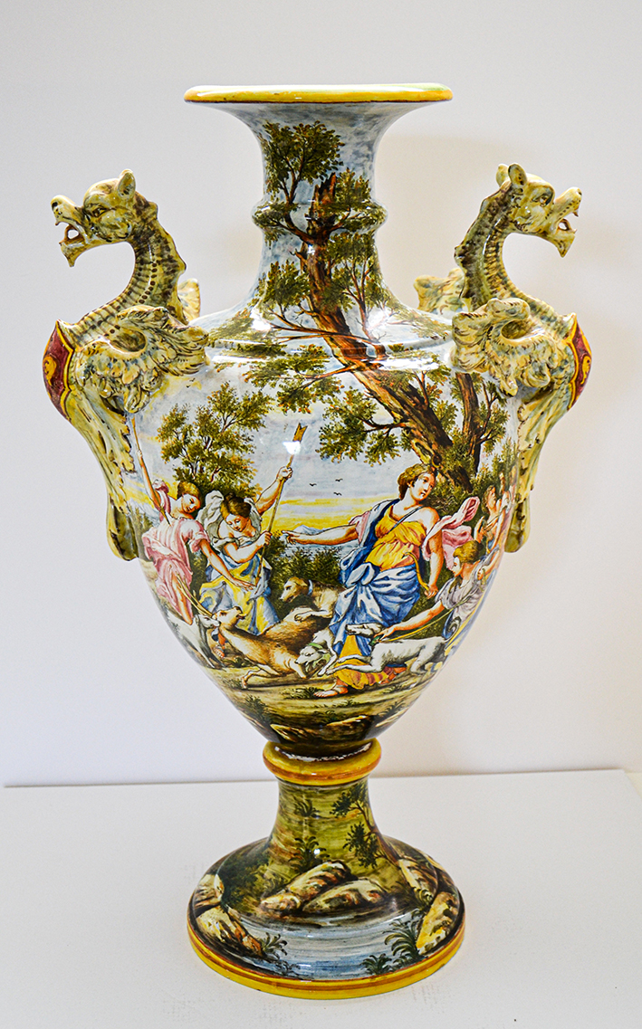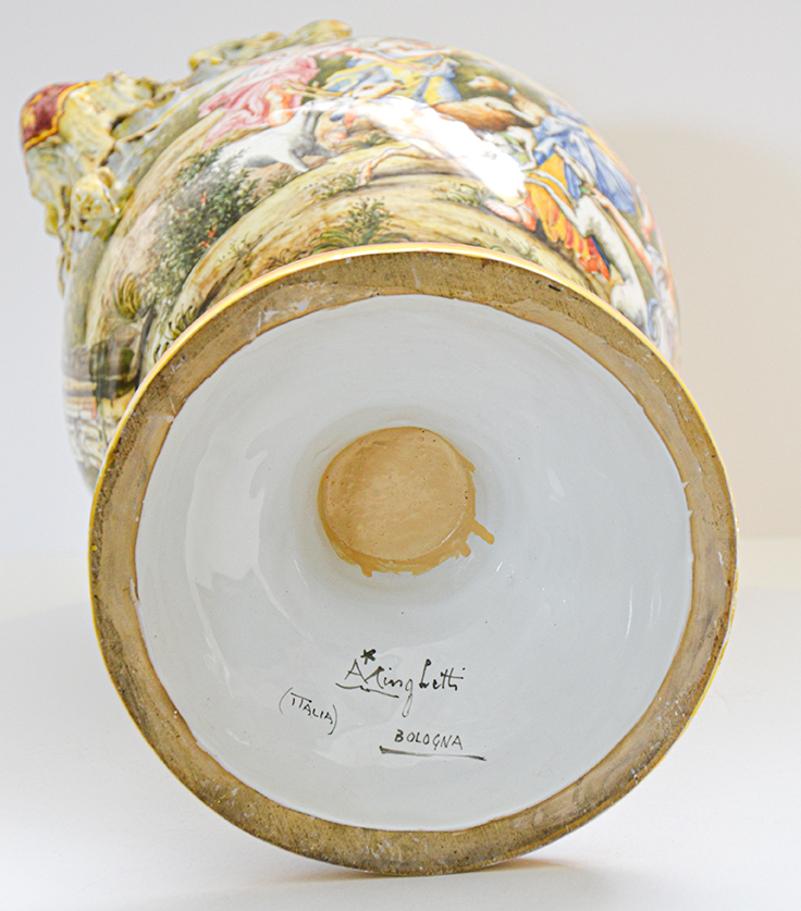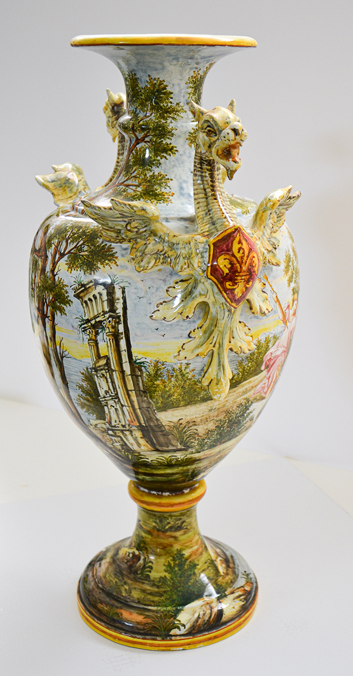 Importante anfora in terracotta maiolicata con anse a foggia di grifone e corpo decorato in policromia al fonte con scene romantiche mentre sul retro è rappresentato un paesaggio.