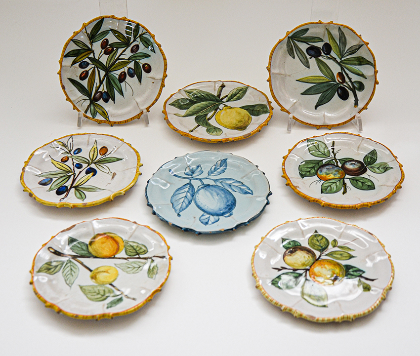 Lotto composto da n° 8 piccoli piatti in maiolica con decorazione policroma sul tema della frutta provenienti dall manifattura Cantagalli di Firenze come da simbolo riposto sul fondo.