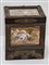 Elegante scatola in legno con borchie in ottone e specchiatture recanti due ricami a mezzo punto raffiguranti rose fiorite; all'interno è custodita una raffinata bottiglietta in vetro sfacettato con decori in oro.