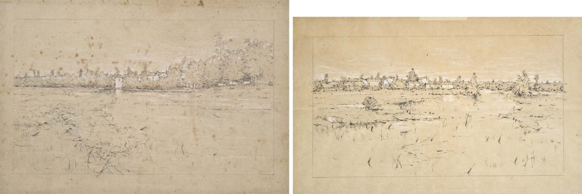 CIARDI GUGLIELMO Venezia 1842 - 1917 Autunno sul Sile - Paesaggio lotto di 2 disegni a matita e biacca su carta 33x34 - 21x32 firma e data al retro (Autunno sul Sile) le carte presentano lievi difetti