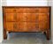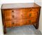 Comò a tre cassetti con fusto in abete e impiallacciatura il noce, montanti mossi con decoro a forma di foglia e piedi a plinto.