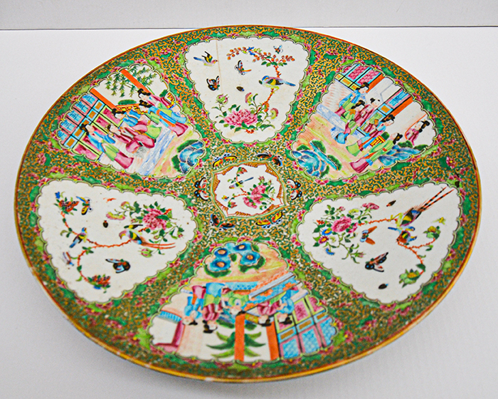 Antico piatto in porcellana policroma, famiglia rosa, con decori a scene d'interni alternati a soggetto naturalistico.