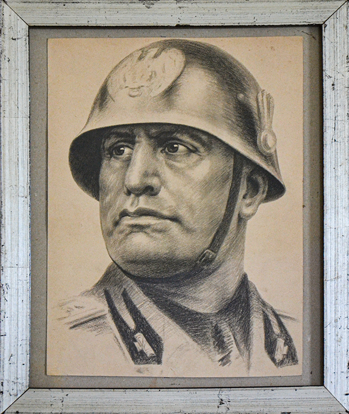 Grafite su cartoncino raffigurante Benito Mussolini in alta uniforme con elmetto