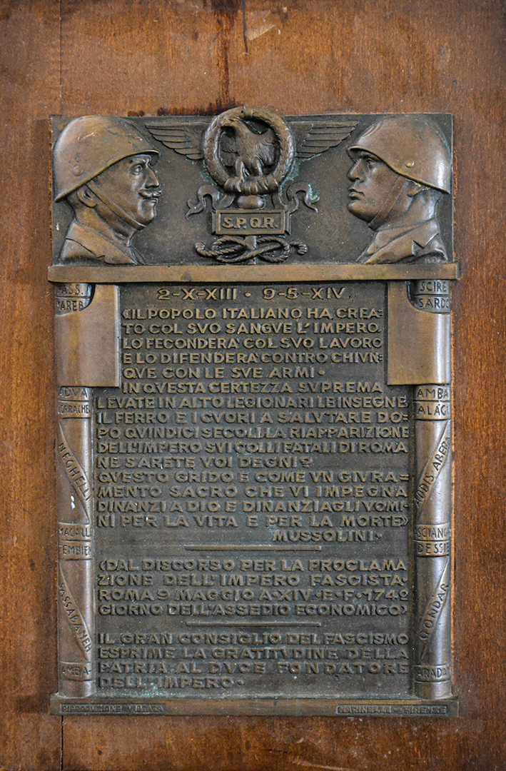 Placca in bronzo celebrativa del periodo fascista recante il discorso di Mussolini per la proclamazione dell'Impero Fascista il 9 Maggio 1936.