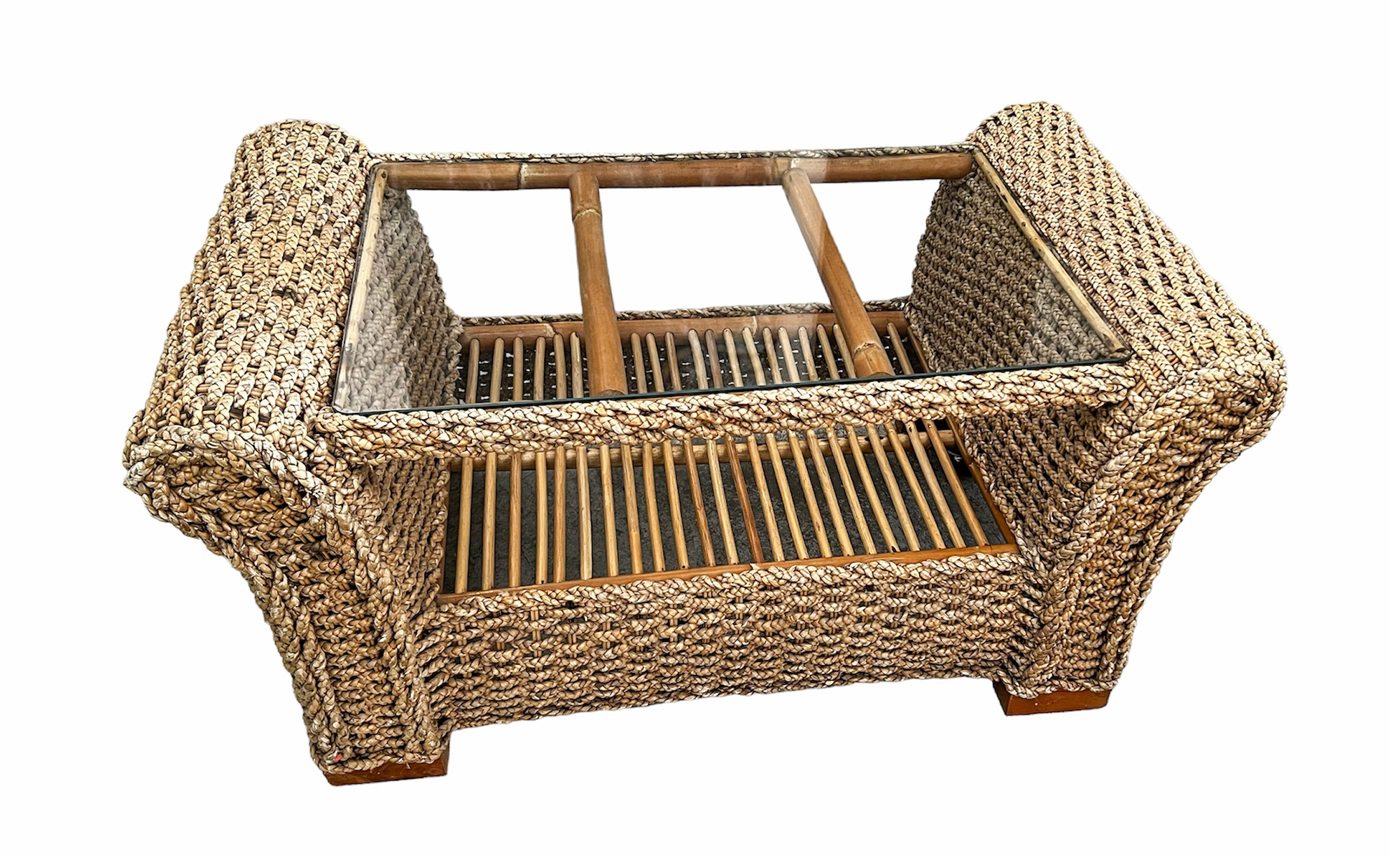 Tavolino in banano naturale e ripiano in cristallo
