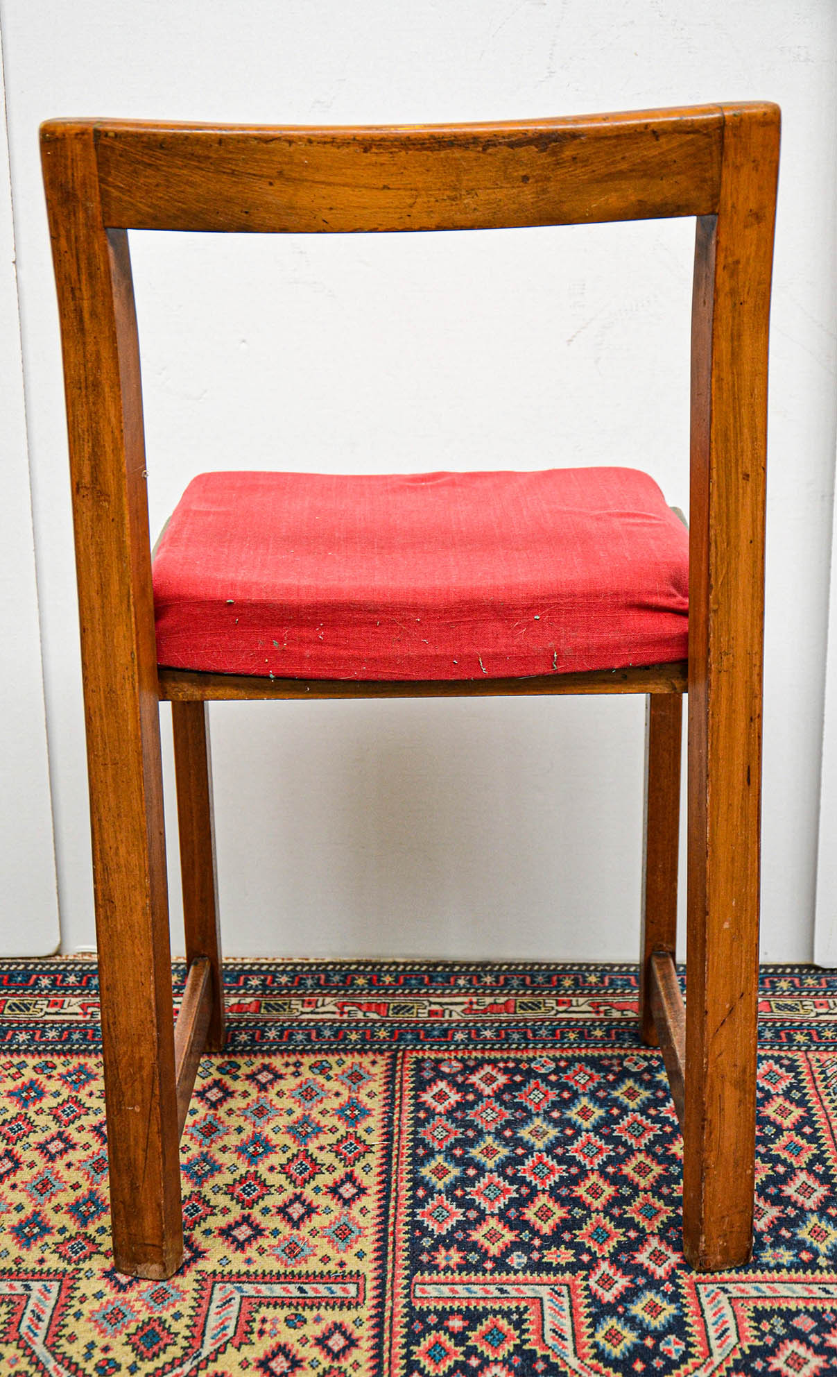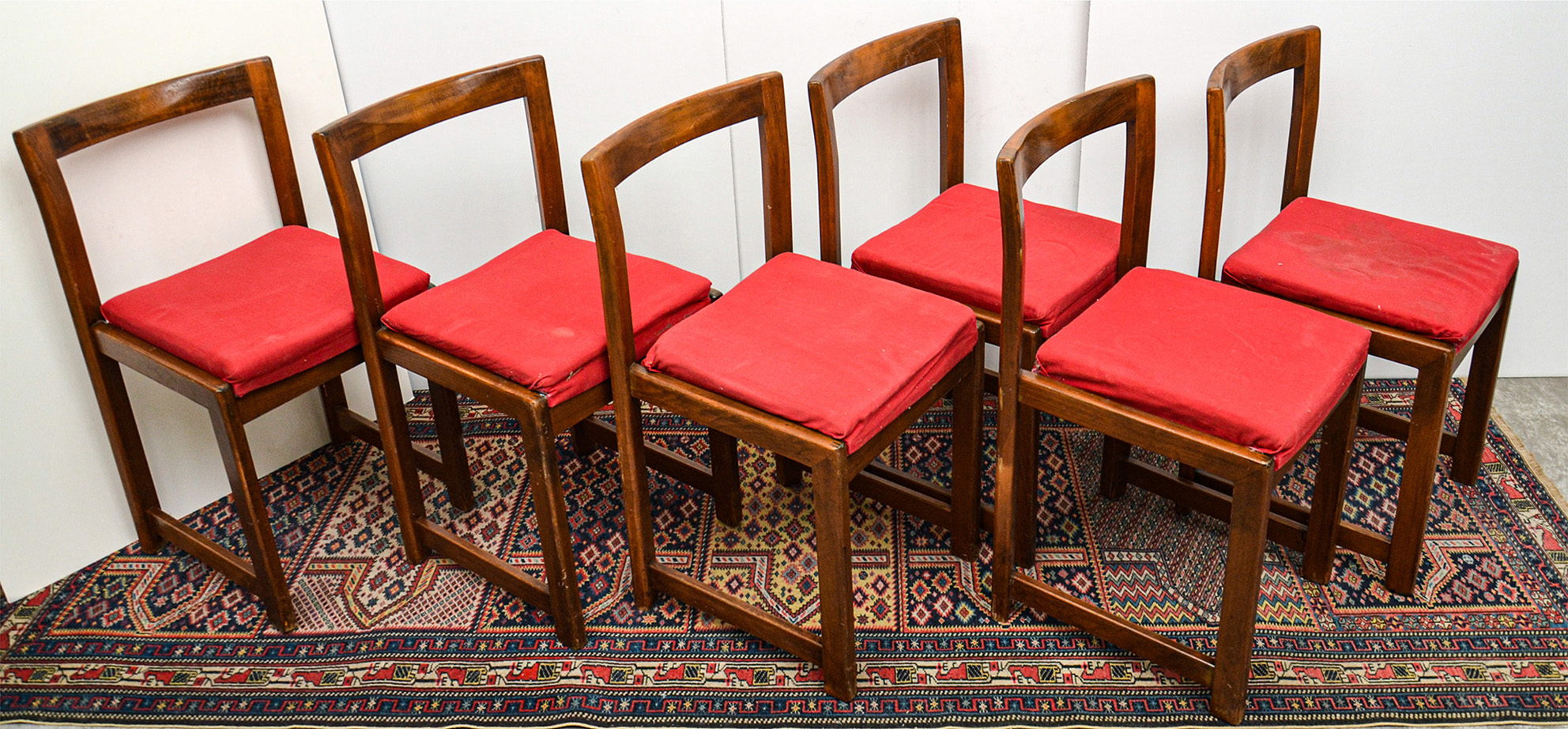 Lotto composto da n° 6 sedie di manifattura artigianale italiana anni'60 con struttura in legno conteddistinte dallo schienale a doga singola.