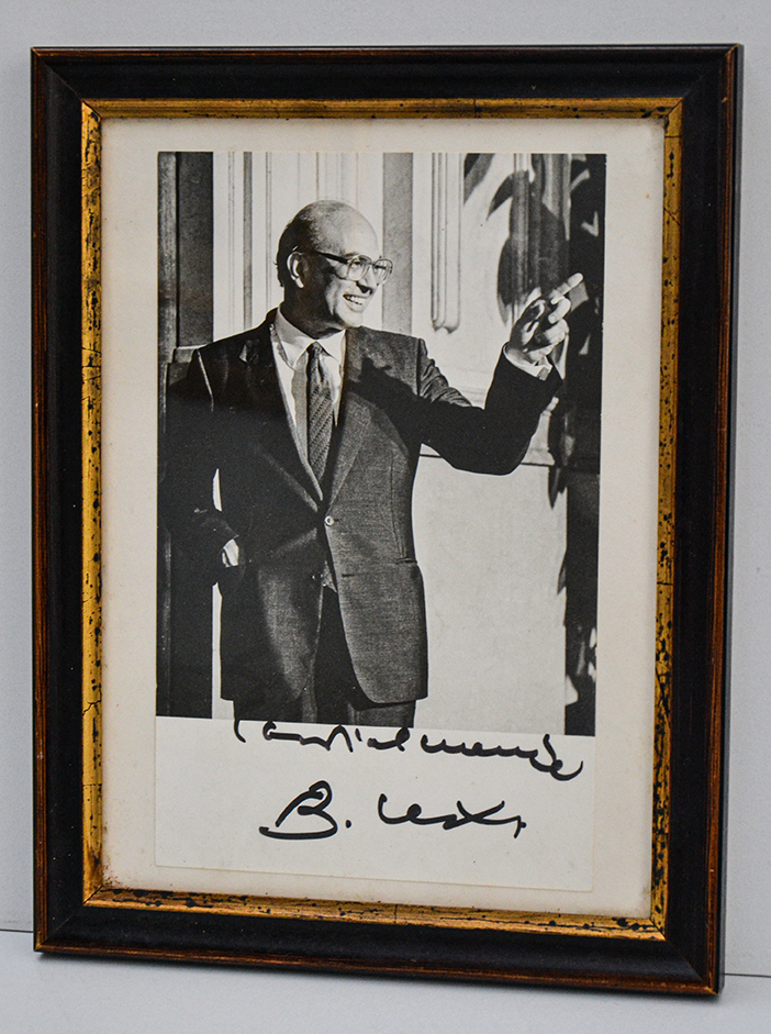 Fotografia in bianco e nero con firma autografa del Presidente del Consiglio Bettino Craxi.