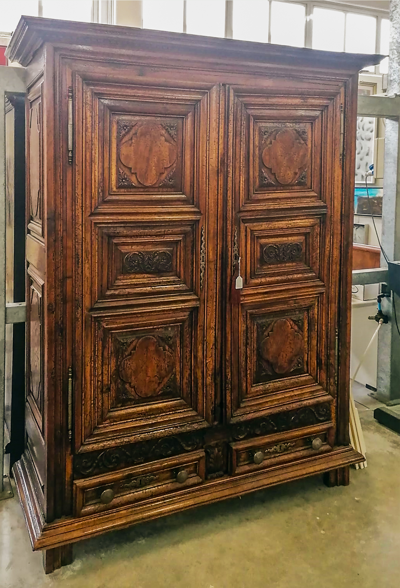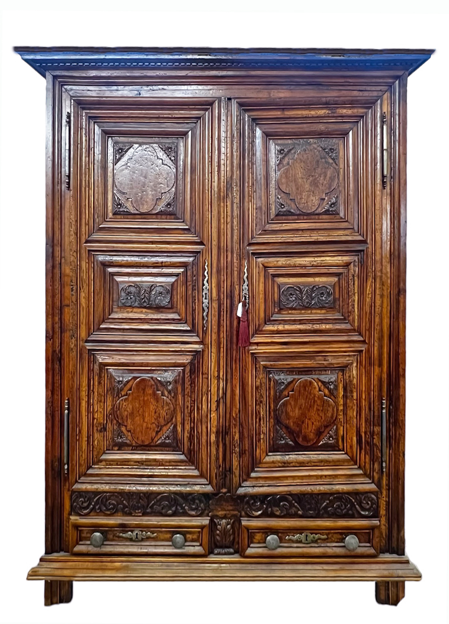 Imponente armadio di fine '700 a due porte in noce ripartite in tre specchiature decorate, struttura in rovere.