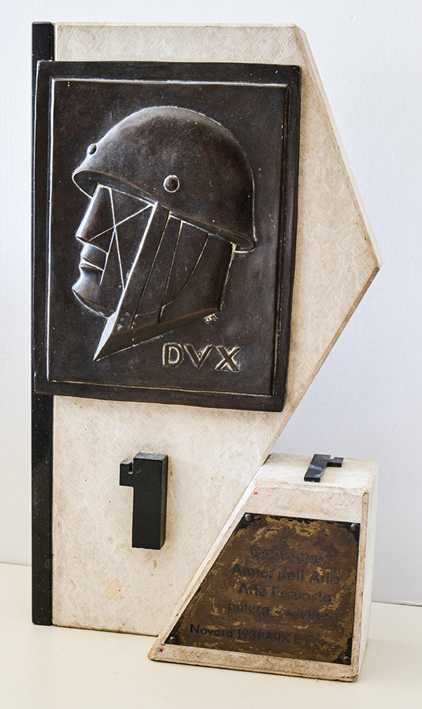 Scultura composta da due parallelepipedi in pietra bianca, la stele più grande è profilata di marmo nero di marquina ed è la base della placca in bronzo raffigurante il profilo elmato del Duce in cui sono presenti le iniziali U.A. (si presume si tratti dello scultore fascista Ugo Antonio) e la scritta DUX, mentre nella seconda parte è apposta una targa trapeziodale in lamierino di ottone con incisa la scritta "Convegno amici dell'arte - Arte Futurista, pittura e scultura Novara 1931 A. IX E.F."