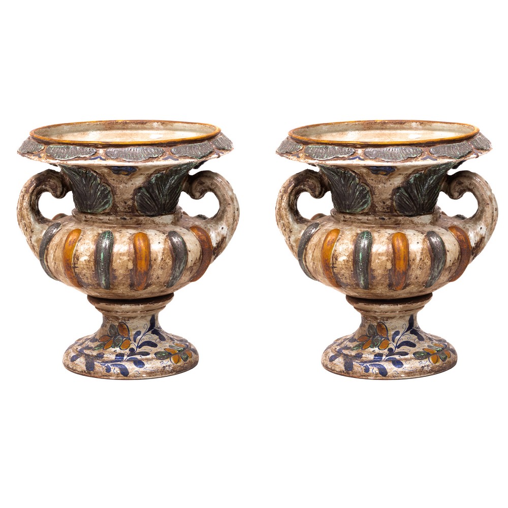 COPPIA VASI a cratere in ceramica decorata e smaltata.