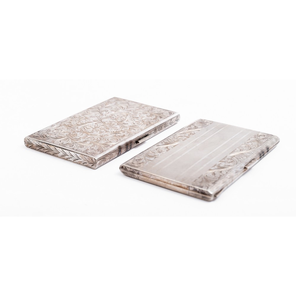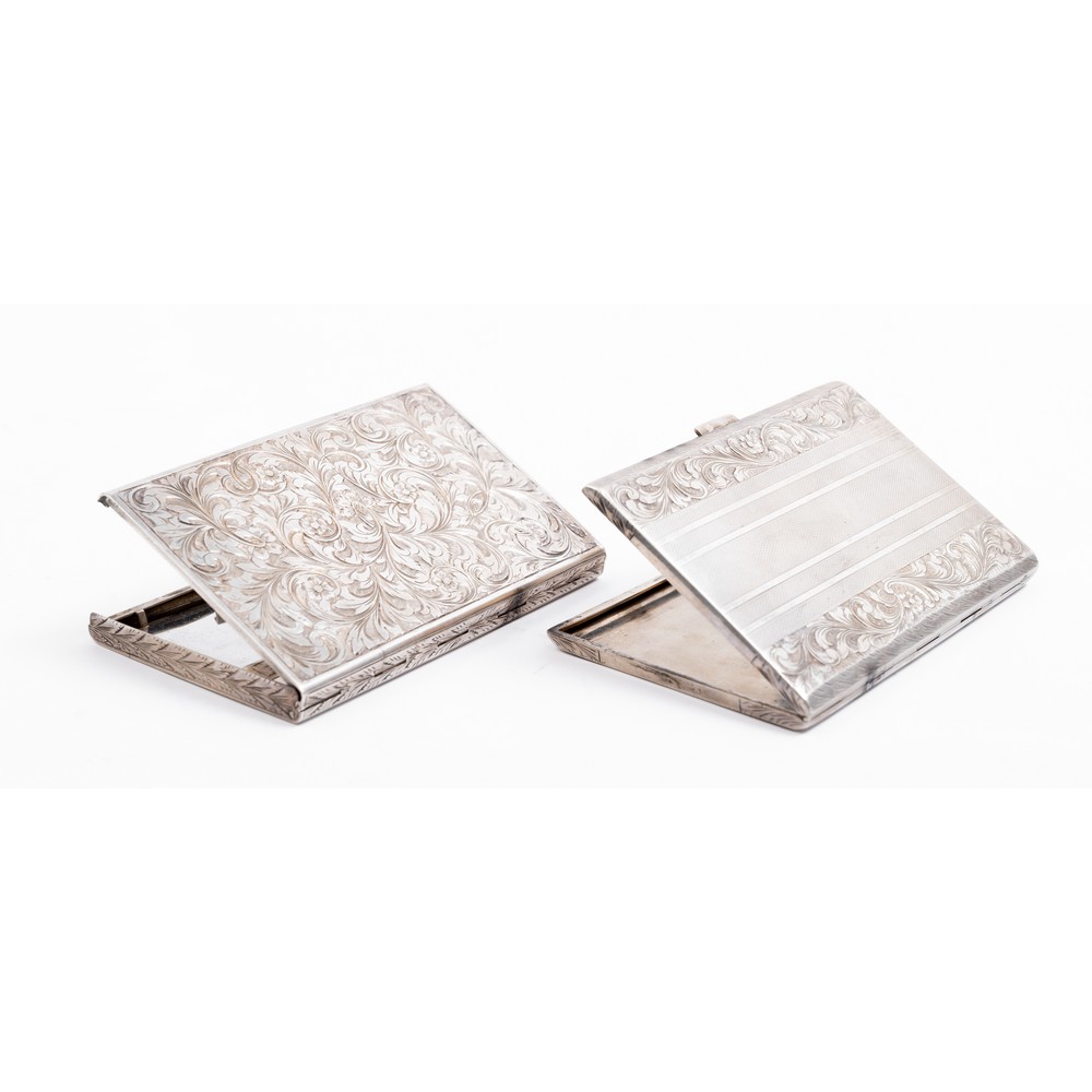 Due portasigarette in argento cesellato a motivo floreale e fogliaceo (g. 312).