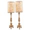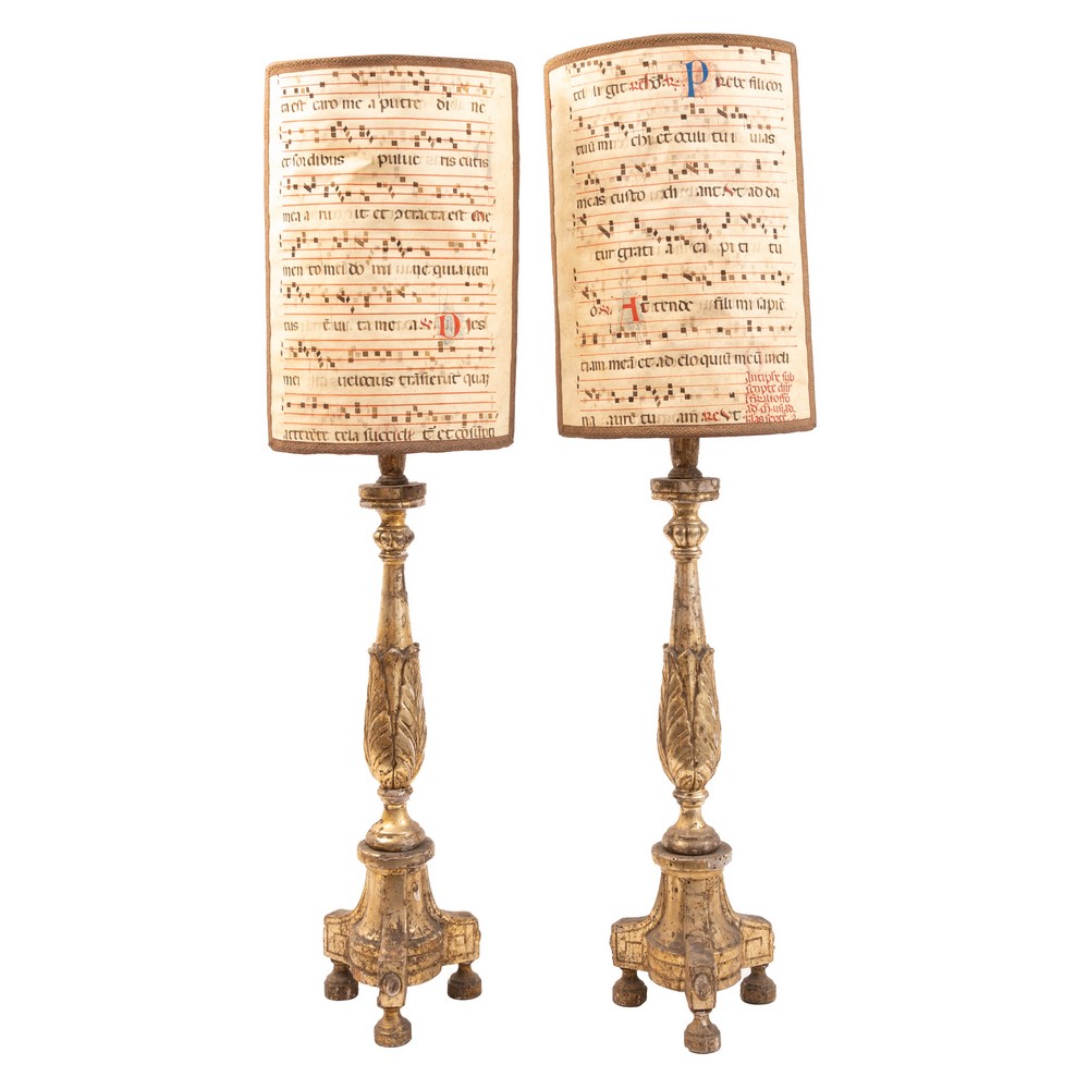 Coppia candelieri in legno dorato ad argento a mecca trasformati in lumi, con ventole con carta di musica ecclesiastica.