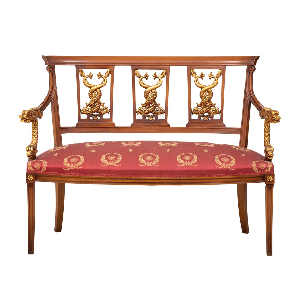 DIVANETTO stile Impero in legno di noce con fregi dorati, tappezzeria nei toni del rosso.