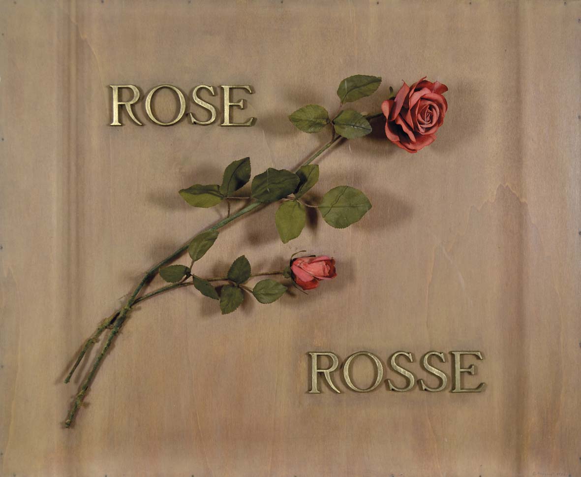 MICCINI EUGENIO Firenze 1925 - 2007 Rose rosse 1976 rose sintetiche e lettere metalliche applicate su tavola 49x60x12 timbro dell'Autore al retro Provenienza: Galleria Valmore Vicenza