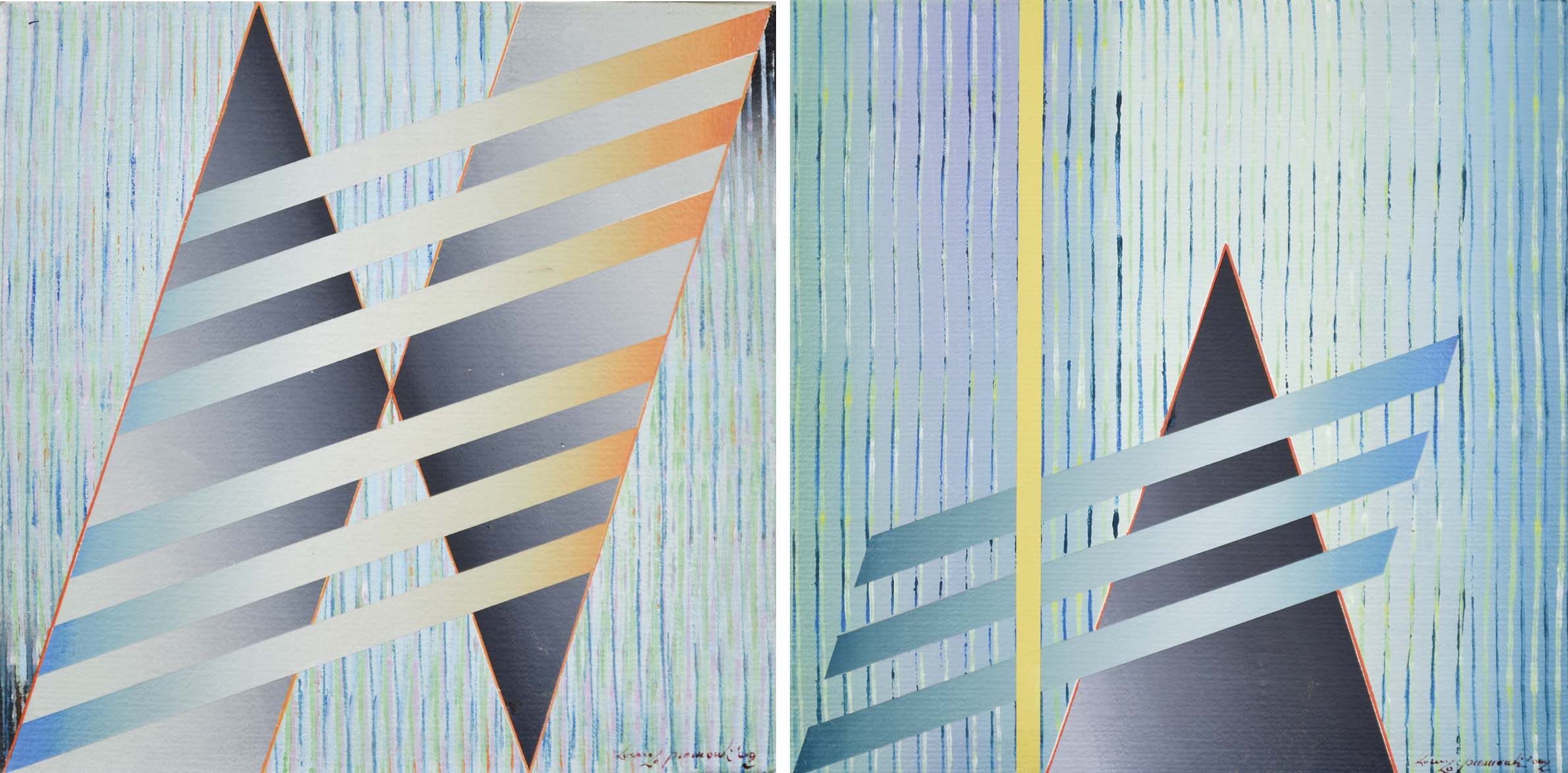 PIEMONTI LORENZO Milano 1935 Accellerazioni 2002 lotto di 2 acrilici su tela 30x30 cad. entrambi firmati e datati in basso a destra Autentica dell'Autore su foto