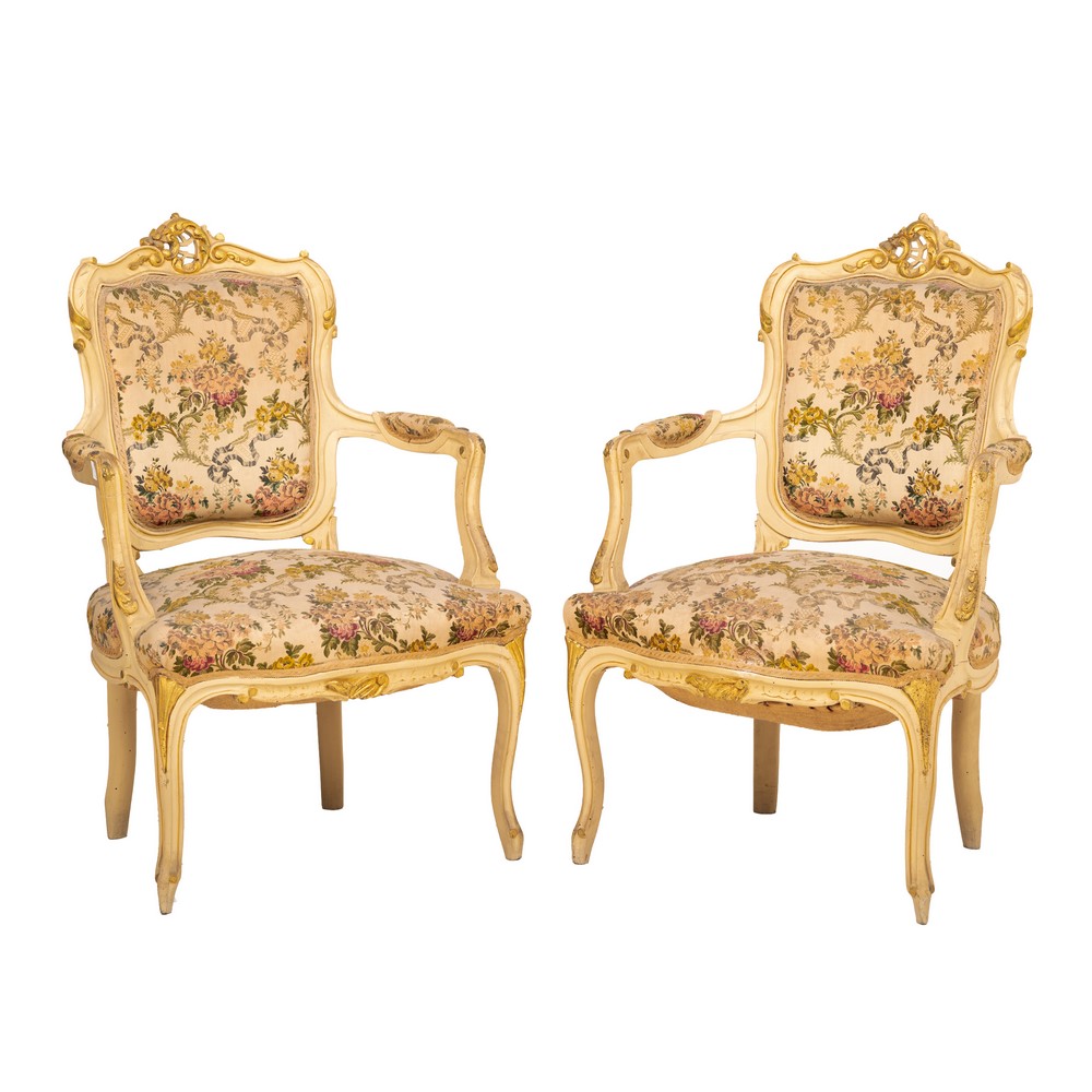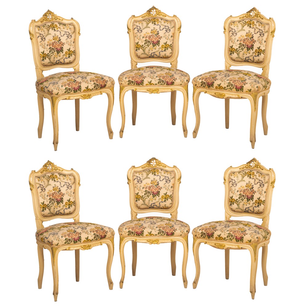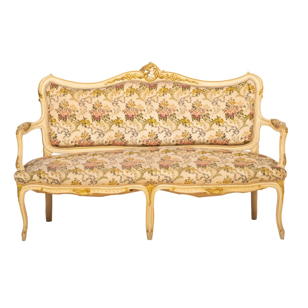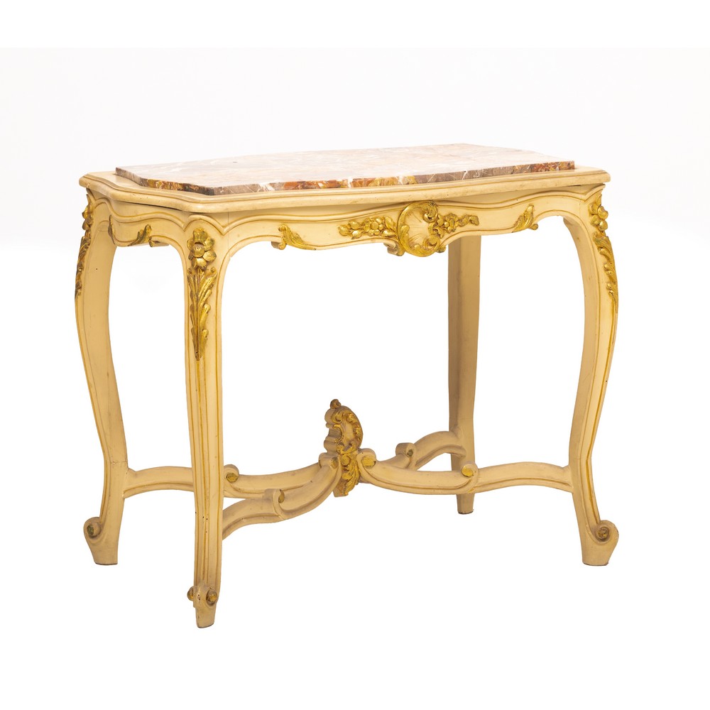 SALOTTO in legno laccato composto da: divano, tavolino con piano in marmo, sei sedie e due poltrone.
