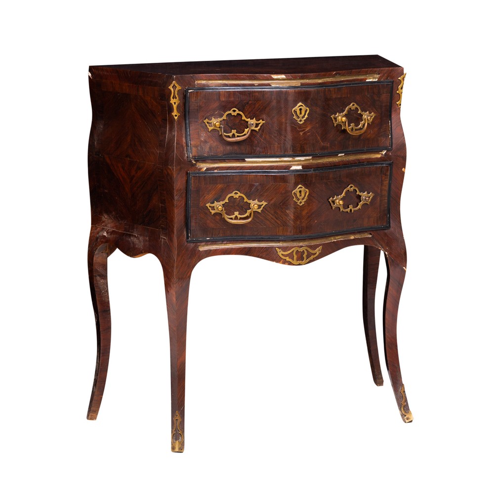 Cassettoncino stile Luigi XV a due cassetti in ebano con maniglie in ottone (usure e mancanze).