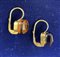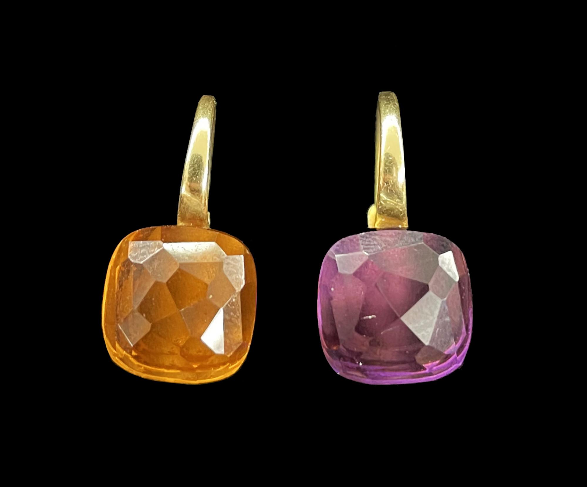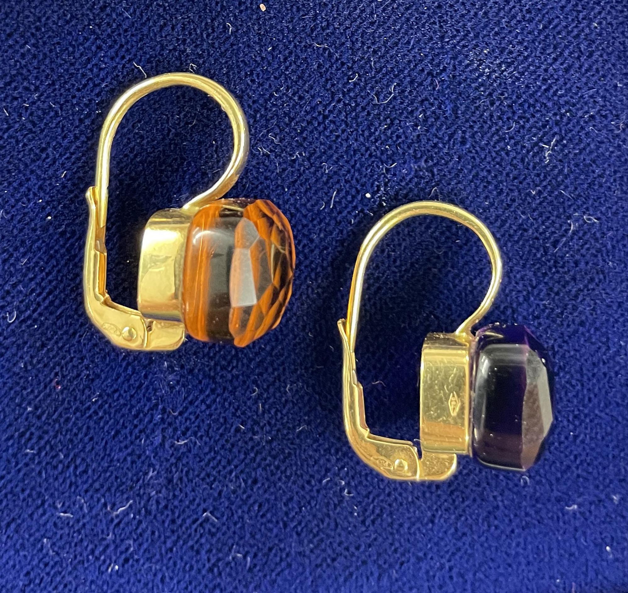 coppia di orecchini con chiusura a monachella, ciascuno impreziosito da una gemma (topazio e ametista), punzone 750 visibile sulla chiusa e sul castone.