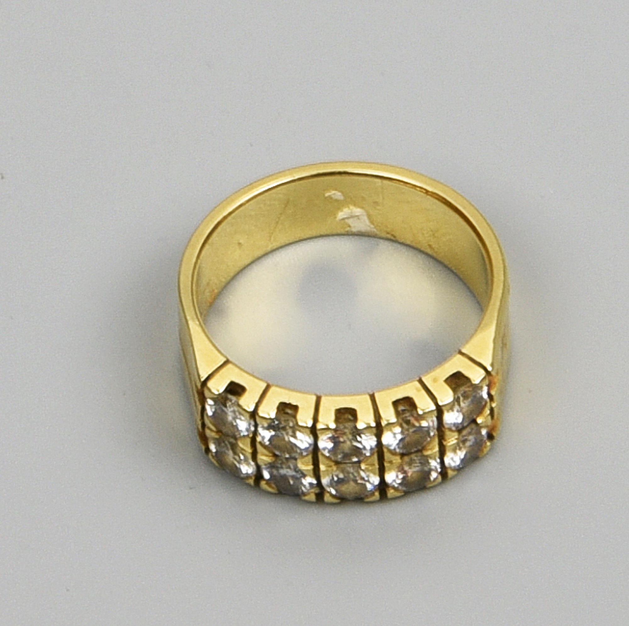 realizzato a due file di diamanti di forma rotonda a brillante per ct. complessivi 1,30 circa. Grado di purezza SI-P1, punzone 750, misura 14. Peso complessivo g 8,6