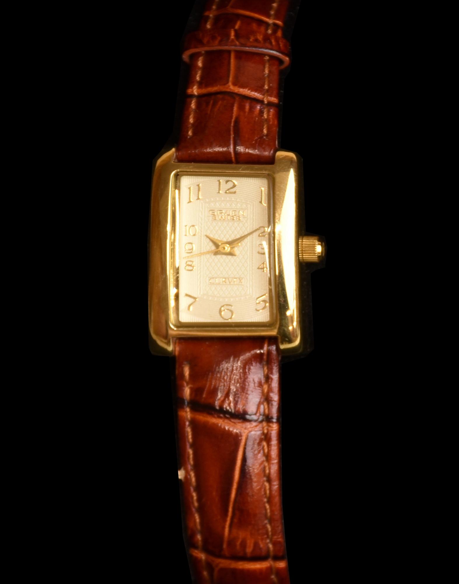 modello Curvex da donna, con movimento al quarzo, in acciaio e oro con cinturino in cuoio e fermezza pertinente