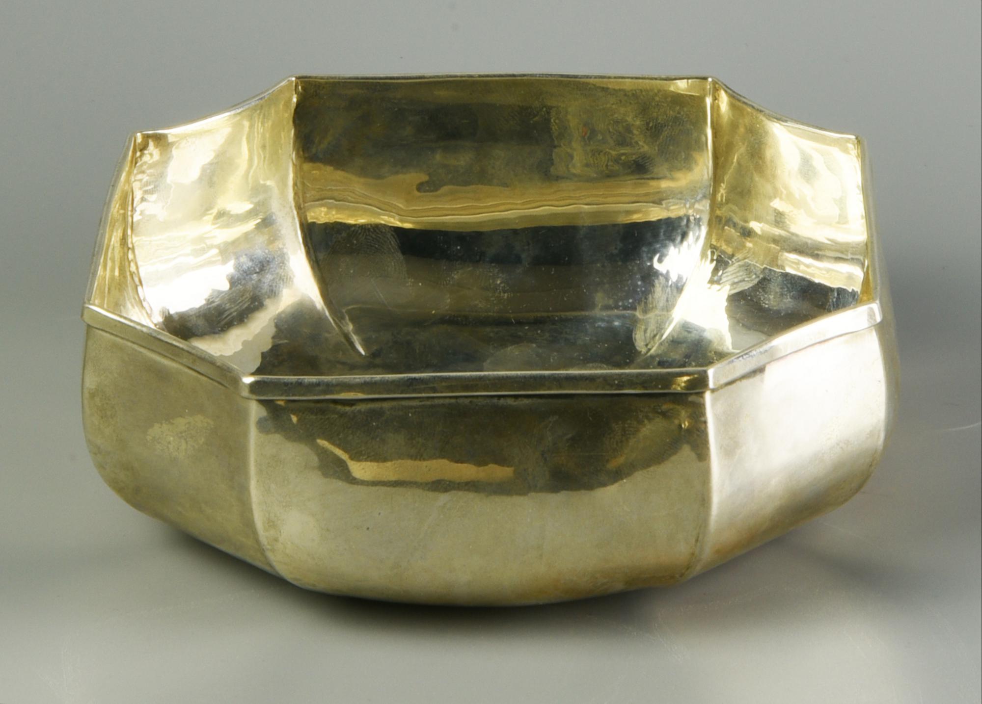 contenitore quadrato ad angoli tronchi, vasca bassa bombata, fondo piano; lavorata a sbalzo; realizzato in argento a titolo 800/1000