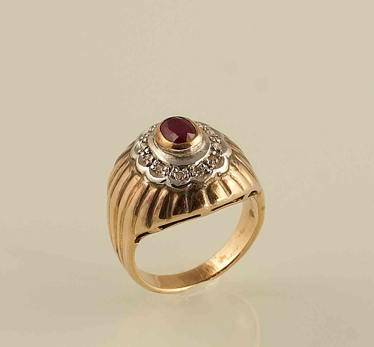 Anello in oro rosso e bianco 14kt con incastonato al centro un rubino ovale per carati 0,40 punti circa circondato da diamanti taglio brillante per 0,25 punti circa, anni 40/50, gr.7,2.