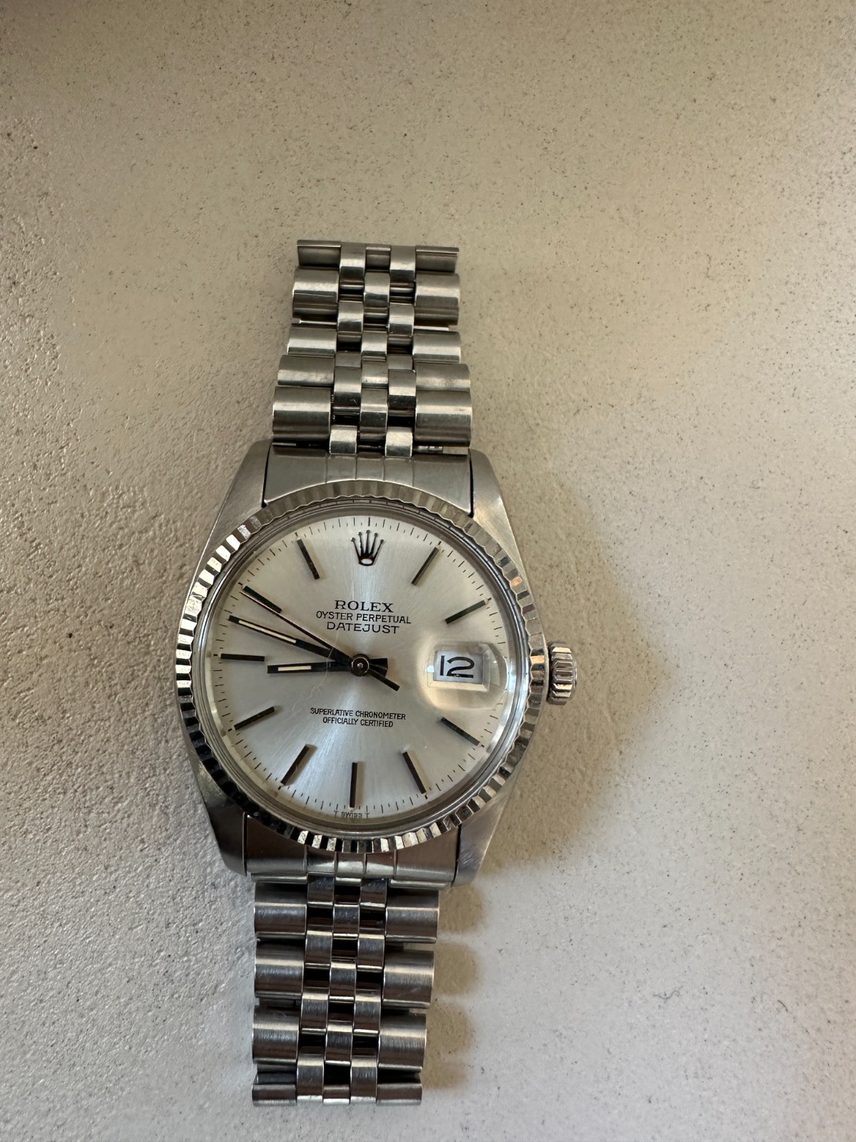 Marca Rolex Modello Datejust 36 Numero di referenza 16014 Carica Automatico Materiale della cassa Acciaio Materiale cinturino Acciaio Anni 80 Condizione Buone (di seconda mano, segni di usura) Corredo Senza scatola originale né documenti originali, garanzia del negozio 12 mesi Calibro Carica Automatico Cassa Materiale della cassa Acciaio Diametro 36 mm Prova Materiale lunetta Oro bianco Vetro Plexiglas Quadrante Argento Numeri sul quadrante Senza numeri Cinturino Materiale cinturino Acciaio Colore cinturino Acciaio Jubilee Chiusura Déployante Materiale chiusura Acciaio Funzioni Data Altro Secondi centrali, Corona a vite