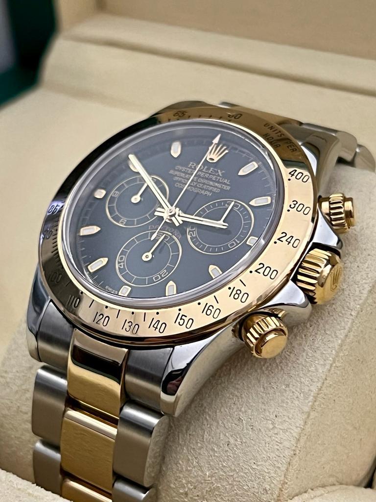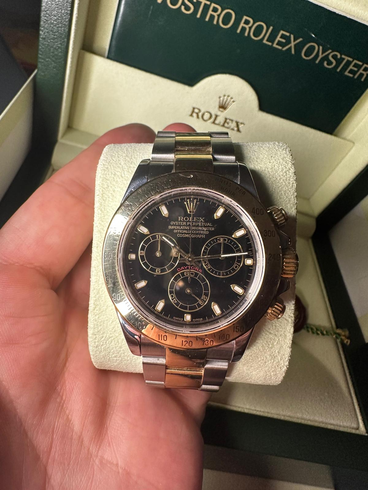 Marca ROLEX Modello DAYTONA Quadrante nero Misura 40mm Condizione usato in ottime condizioni Ref 116523 Anni 2002/2007 Materiale acciaio e oro 18ct Cinturino oyster Acc oro 18ct Garanzia Rolex no box