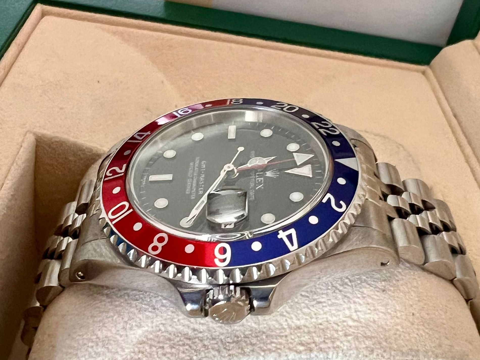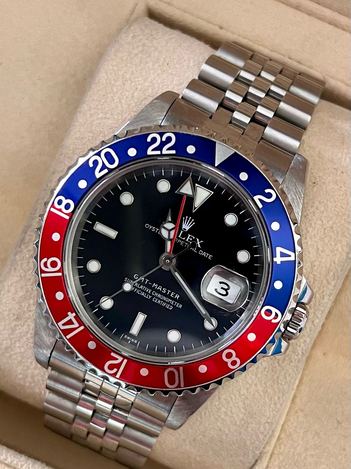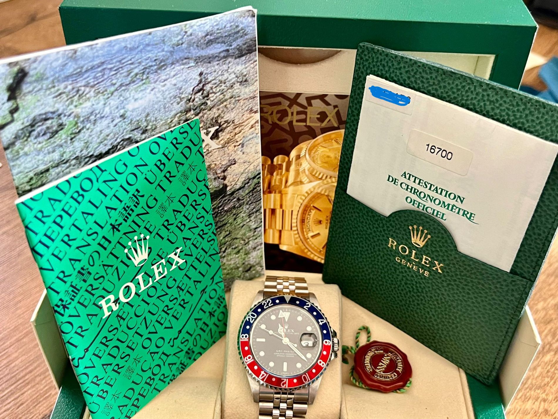 Marca Rolex Modello (Orologio) GMT-Master Numero di referenza 16700 Carica Automatico Materiale della cassa Acciaio Materiale cinturino Acciaio Anni 90 Condizione Ottimo Corredo con documenti originali Materiale della cassa Acciaio Diametro 40 mm Impermeabile 10 ATM Materiale lunetta Acciaio Vetro Vetro zaffiro Quadrante Nero Cinturino jubilee Materiale cinturino Acciaio Colore cinturino Acciaio
