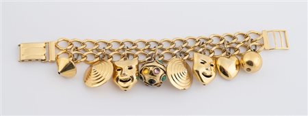 Bracciale in metallo dorato con otto charmes. Cm 5x20.