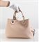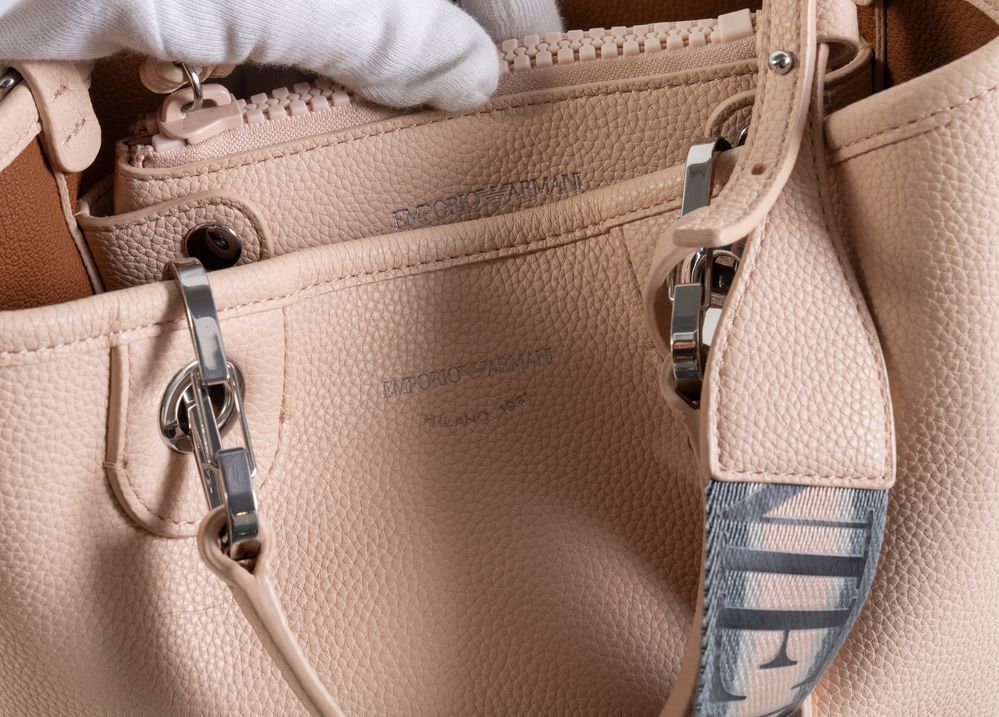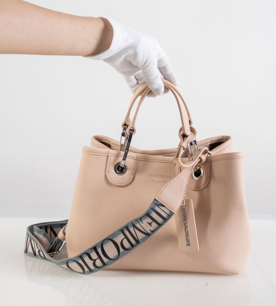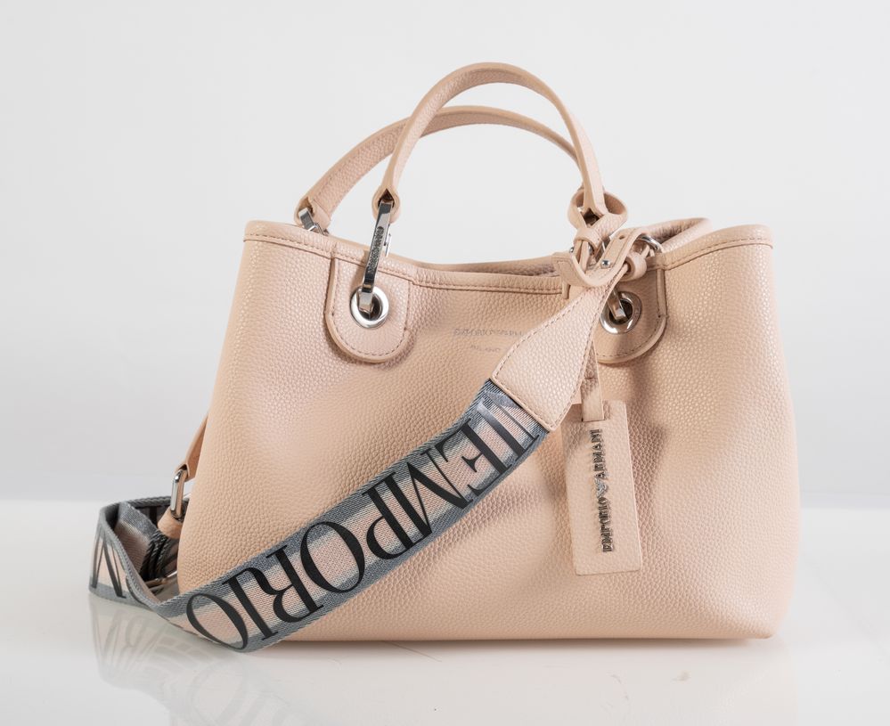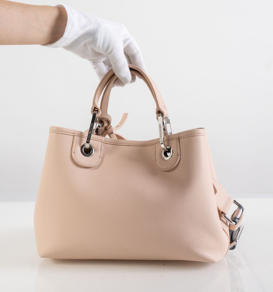 EMPORIO ARMANI Borsa a mano in similpelle effetto martellato color rosa cipria con finiture in metallo argentato. Cm 20x26x10; altezza con manici cm 31. Tracolla regolabile e removibile in tela rigata e loggata. All'interno reca due scamparti separati da un astuccio removibile. Reca marchi Emporio Armani, Milano 1981. Corredata da dustbag. (lievissimi difetti)