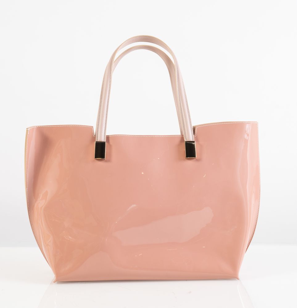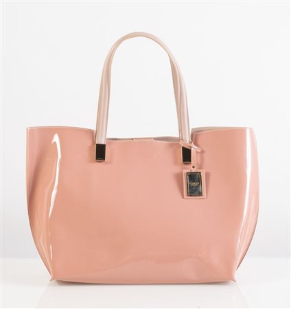 FABIANI Borsa in vernice e pelle rosa. Cm 30x48x16,5; manici 53. Dettagli in metallo dorato. All'interno reca quattro tasche. Reca marchio Fabiani Made in Italy.