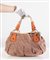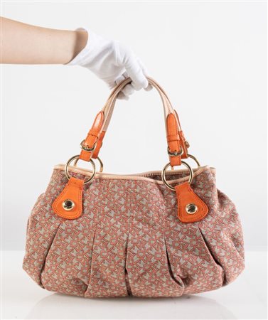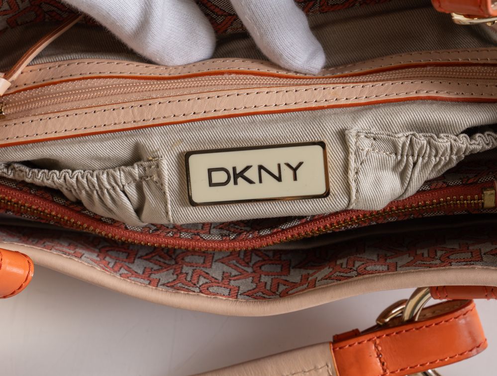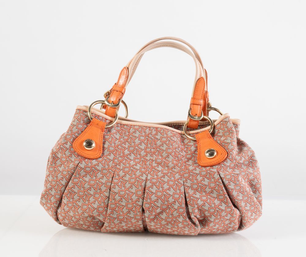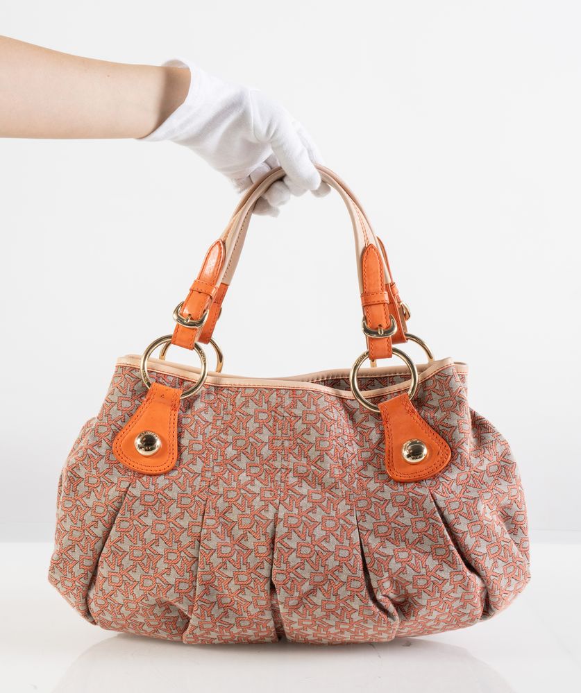 DKNY Borsa in tela monogram sui toni dell'arancione e del beige. Cm 25x40x10; manici cm 45. Dettagli in pelle e metallo dorato. All'interno reca due scomparti separati da una tasca con cerniera. Reca marchio DKNY. Corredata da dustbag. (lievi difetti)