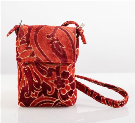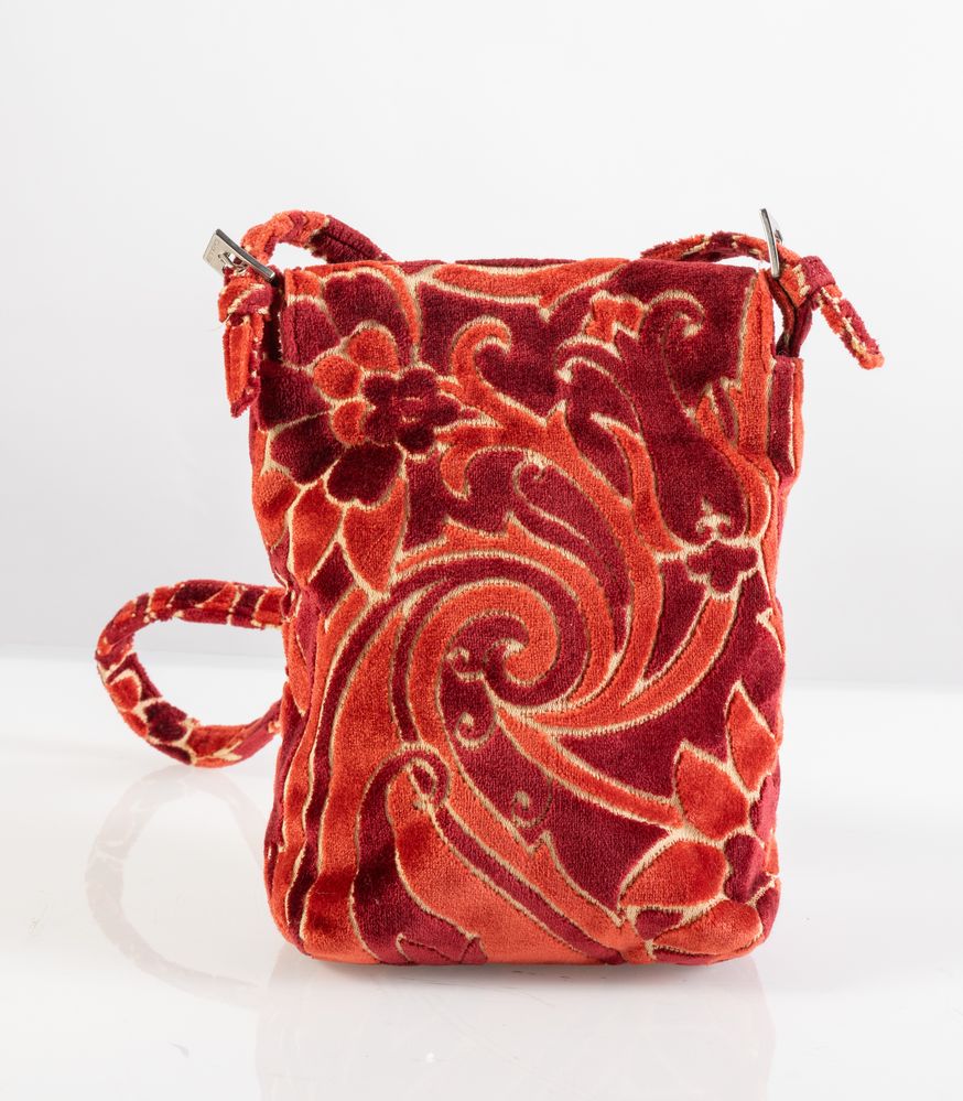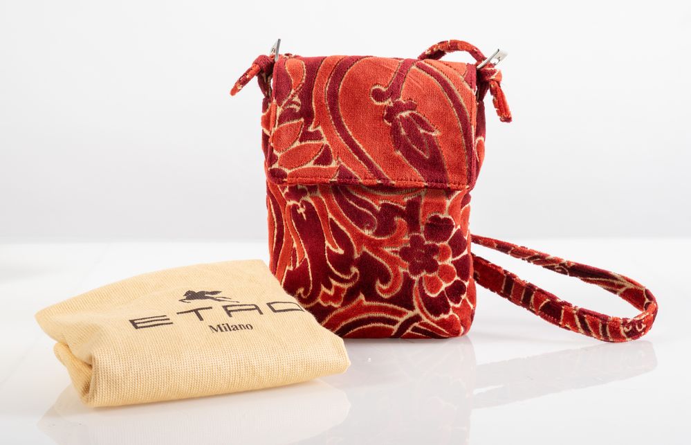 ETRO Borsa a tracolla in velluto a fantasia damascata sui toni del rosso e del bianco. Cm 23x16,5x8; tracolla cm 110. Reca marchio ed etichetta Etro, Milano e Made in Italy e codice di riferimento prodotto. Accompagnata da dustbag.