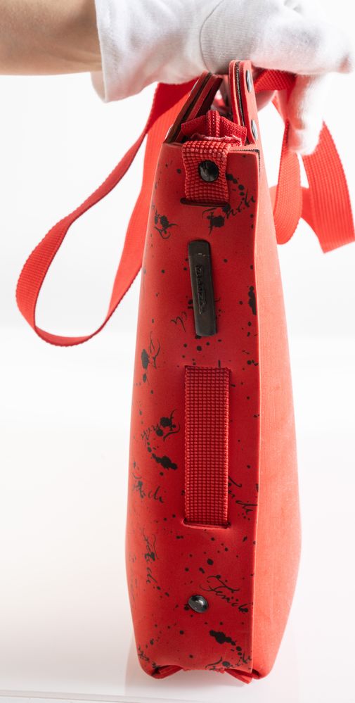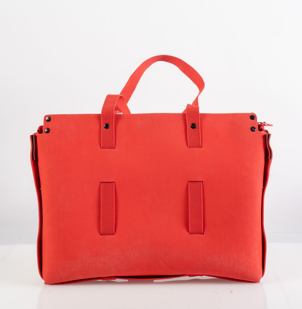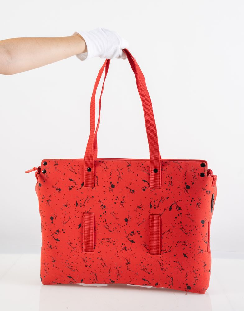 FENDI Borsa in neoprene rosso con logo Fendi e inserti in tessuto. Cm 33,5x50x11; altezza con manici cm 62. Reca marchi FF e Fendi.