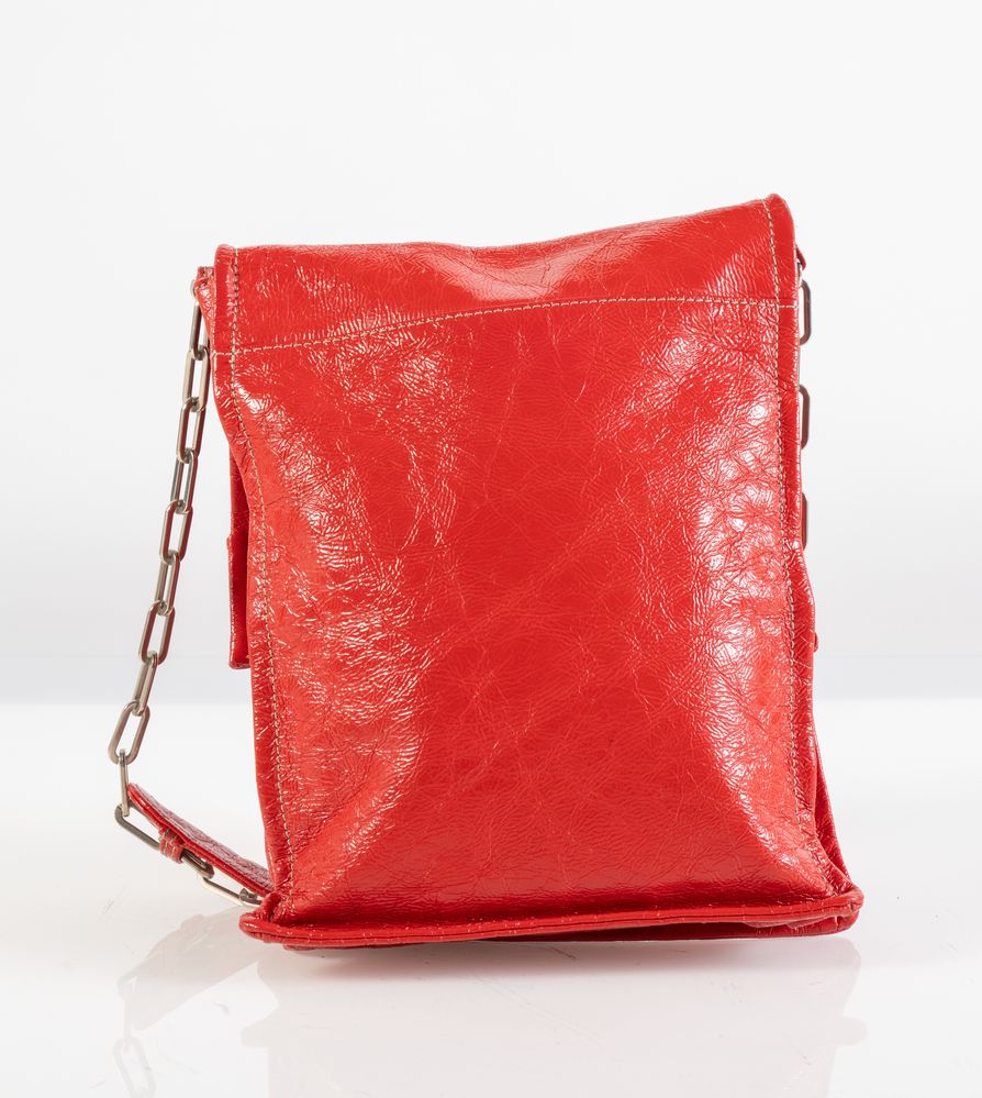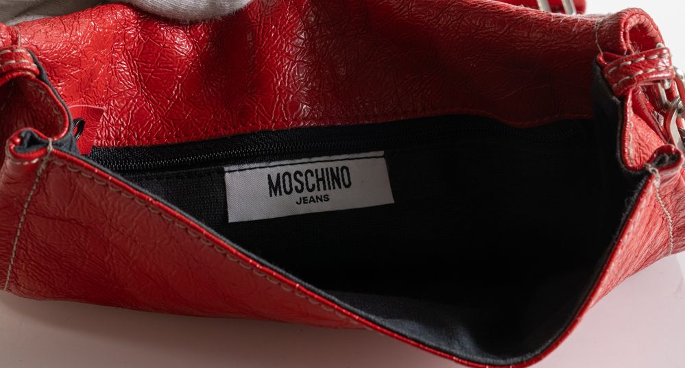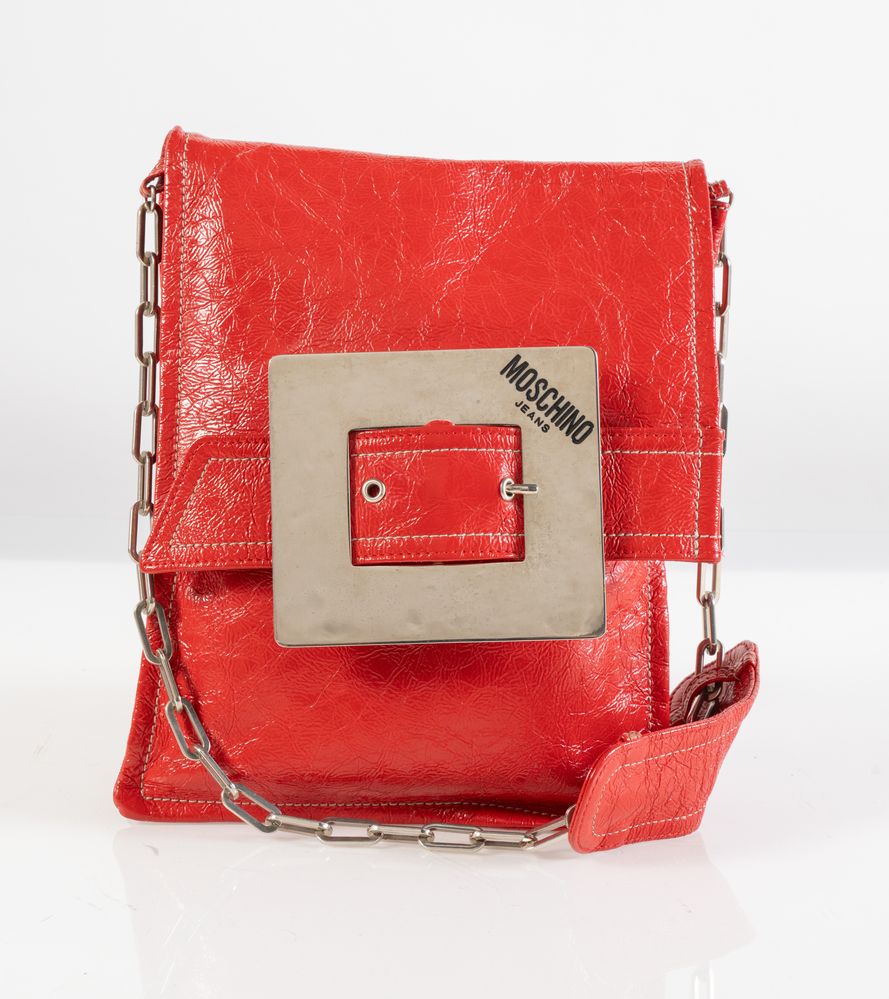 MOSCHINO JEANS Borsa a tracolla in vernice rossa con fibbia in metallo argentato. Cm 27,5x22,5x7; tracolla cm 78. All'interno reca tasca. Reca etichetta e marchio Moschino Jeans.