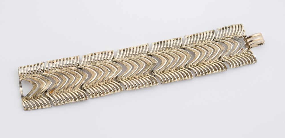 CORO Bracciale in metallo dorato. Cm 3,5x19. Al retro reca marchio Coro. (difetti)