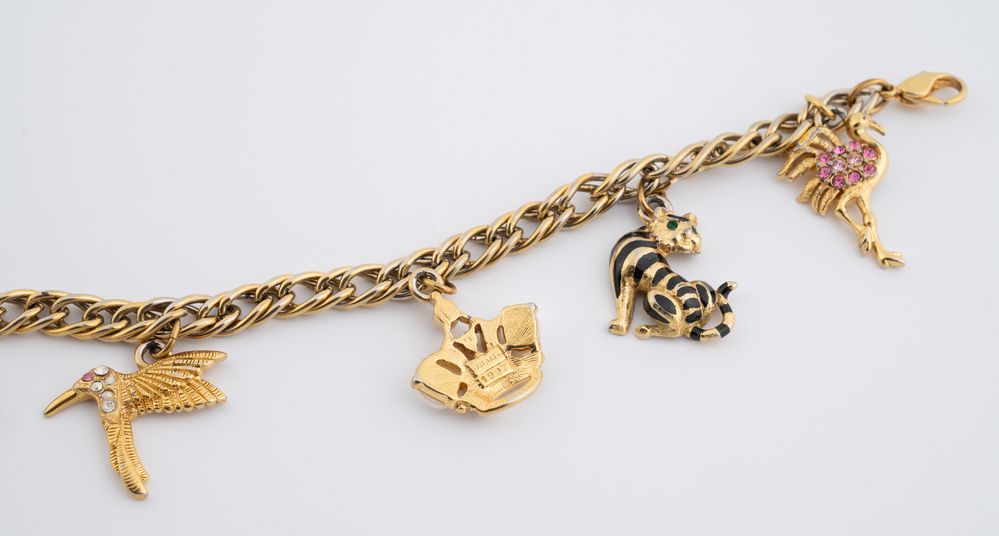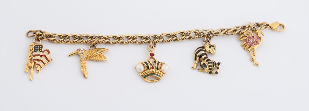 TRIFARI Bracciale a catena in metallo dorato con charms impreziositi da smalti, strass e perle. Anno 1997. Catena lunghezza cm 20. Al retro reca su uno charm marchio Trifari 1997. (lievissimi difetti)