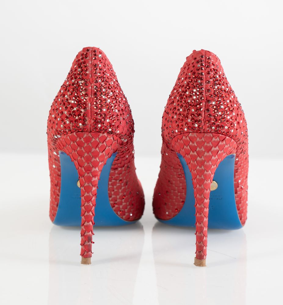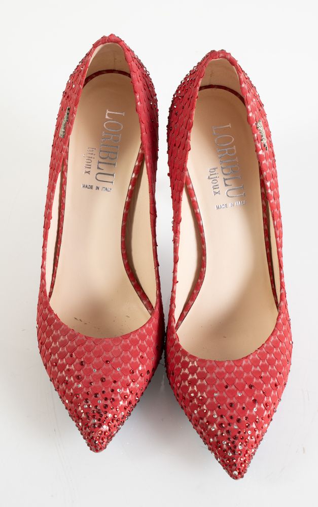 LORIBLU Scarpe décolleté in pelle scamosciata rossa effetto serpente con applicazioni di strass. Taglia 39. Tacco cm 11. Reca marchio Loriblu Bijoux Made in Italy. Corredate da scatola e dustbag. (lievissimi difetti)