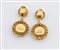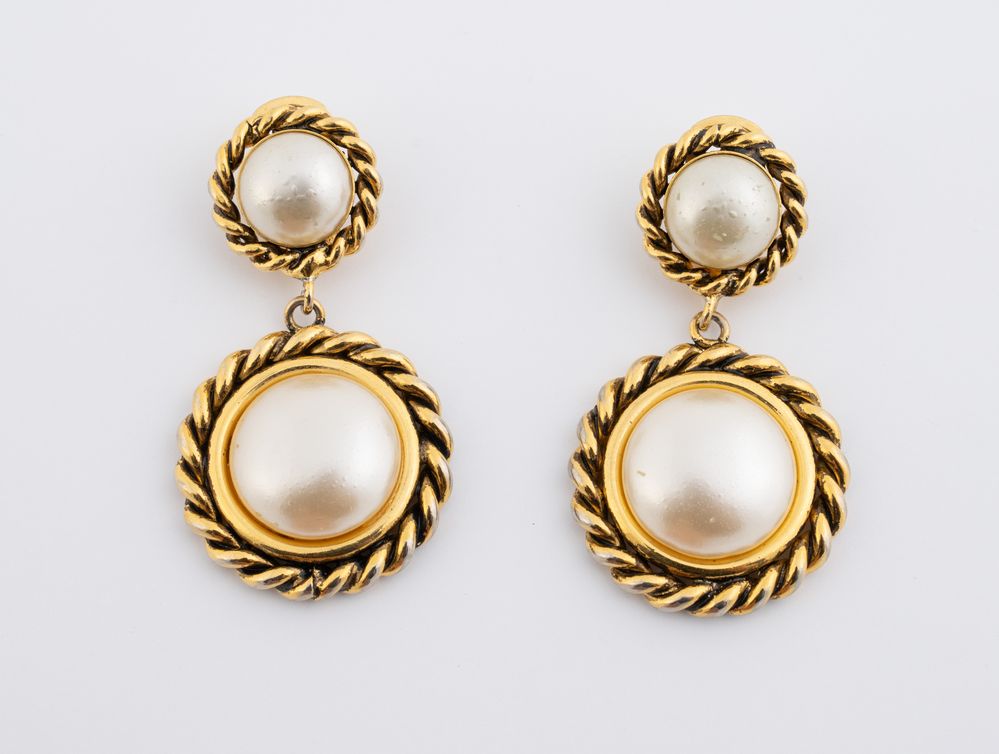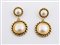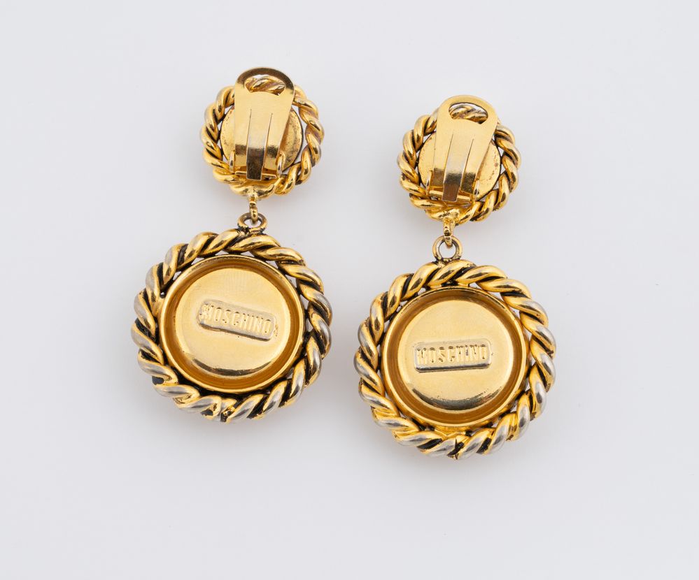 MOSCHINO Orecchini a clip pendenti in metallo dorato e perle. Cadauno di cm 5x3. Al reco recano marchio Moschino. (lievissimi difetti)