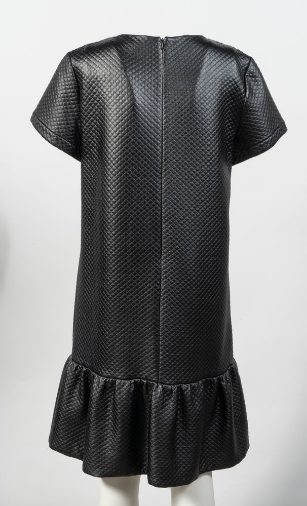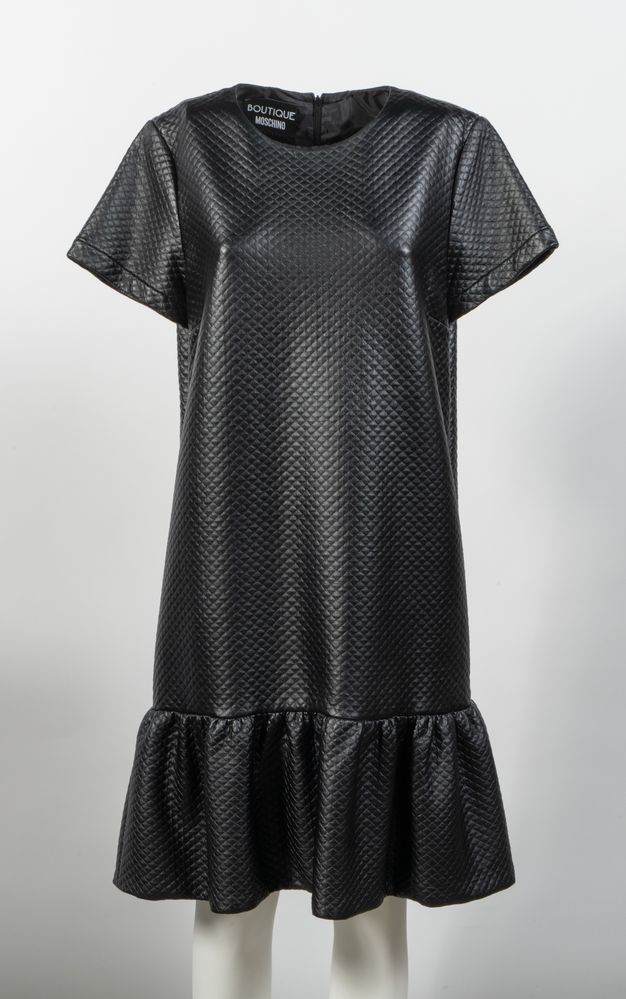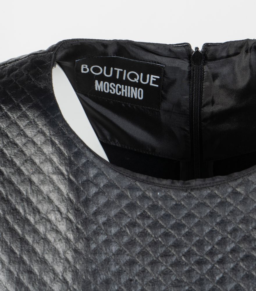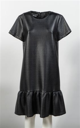 MOSCHINO Boutique Abito in similpelle nero con lavorazione matelassé e balza sul fondo. Anno 2014. Riporta taglia IT 44 - FR 40. Composizione 78% poliestere, 20% rayon e 2% altre fibre. Reca etichetta Moschino Boutique. (Difetti)