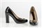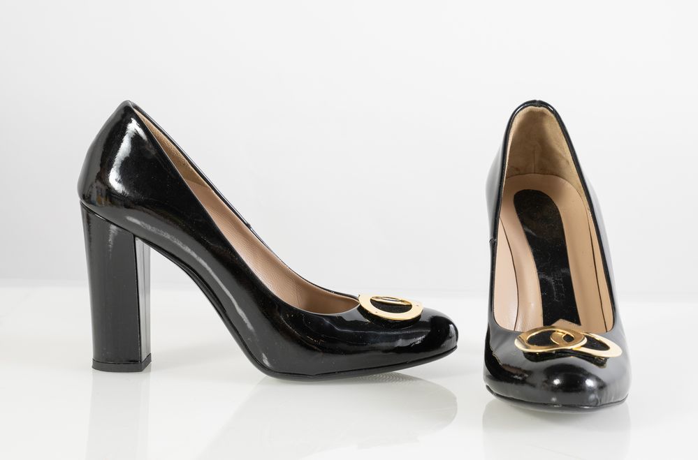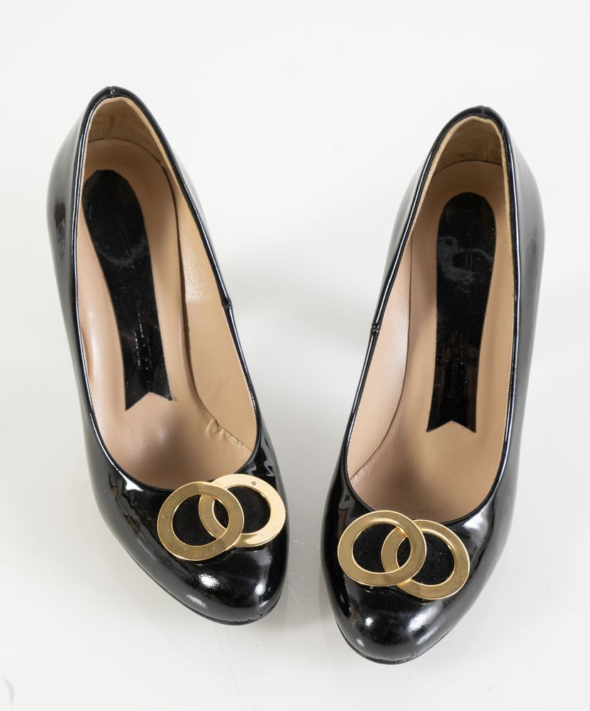 MARCO MASSETTI Scarpe décolleté in vernice nera con applicazione in metallo dorato. Taglia 39. Tacco cm 10. Recano marchio Marco Massetti, Made in Italy.