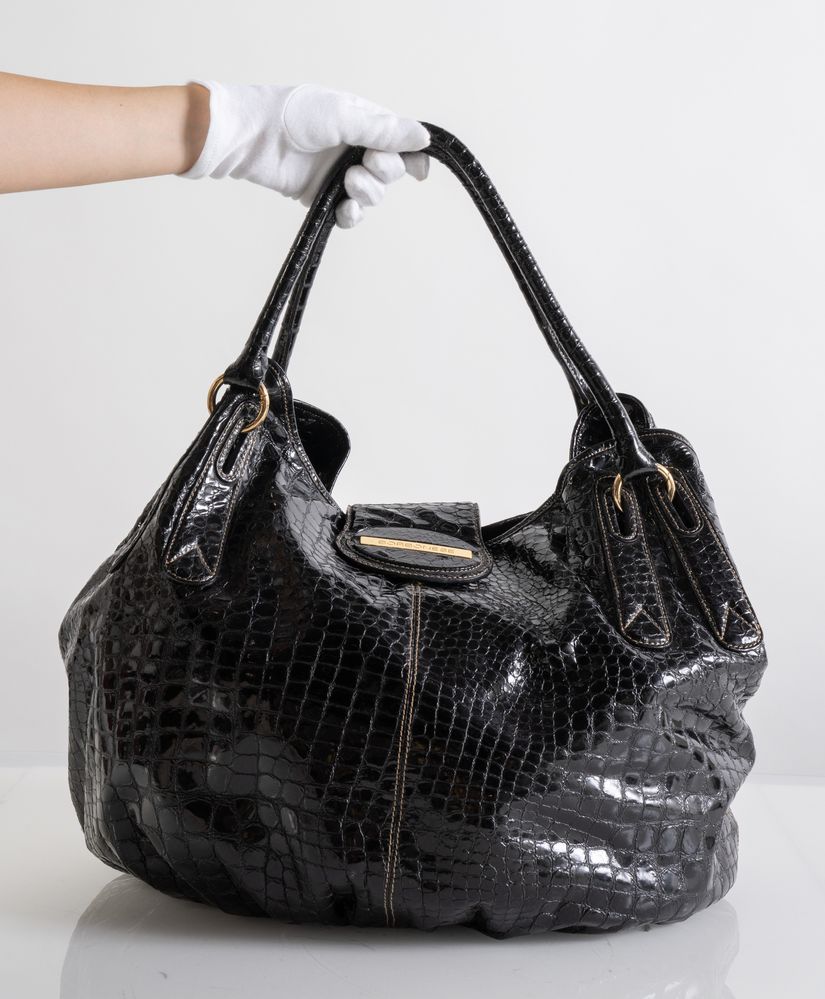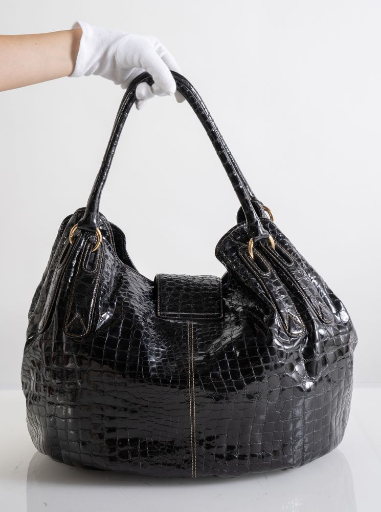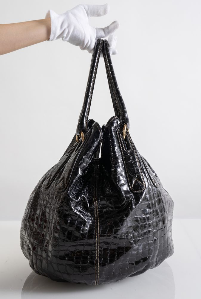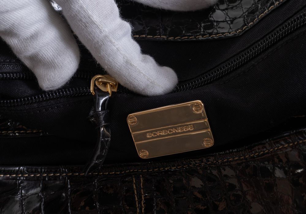BORBONESE Borsa in vernice a stampa coccodrillo rifinita con cuciture bianche e metallo dorato. Cm 32x42x20; altezza con manici cm 50. All'interno reca due scomparti separati da una grande tasca e due tasche. Reca marchi Borbonese, Made in Italy.