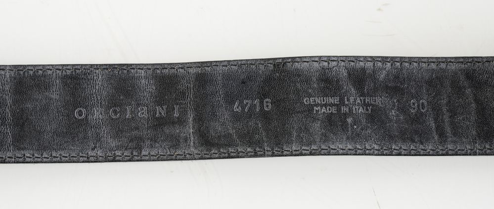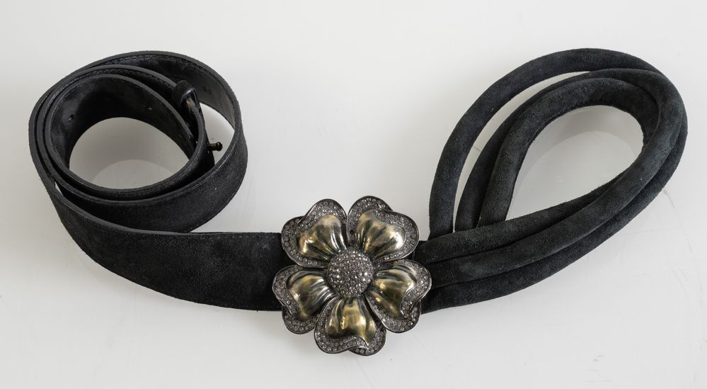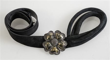 ORCIANI Cintura in pelle scamosciata nera con applicazione a floreale in metallo argentato e strass. Taglia 90. Lunghezza totale cm 110. Fascia spessore cm 4. Reca marchio Orciani, Genuine Leather e Made in Italy. (lievissimi difetti)