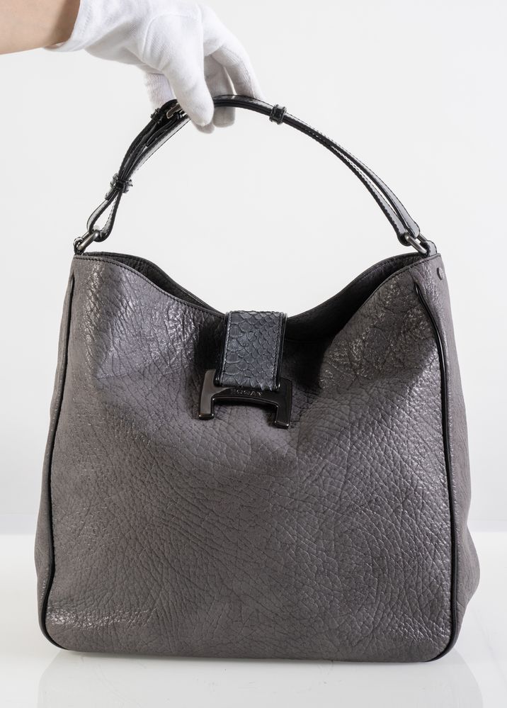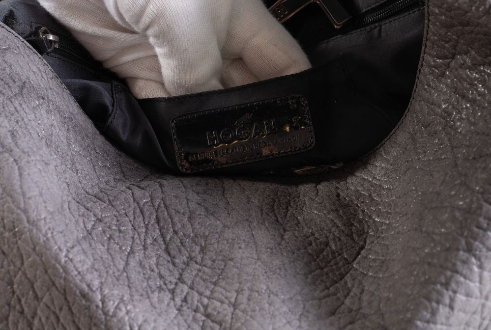 HOGAN Borsa in pelle martellata sui toni del grigio scuro con logo in metallo. Cm 32,5x33x14. Dettagli in vernice nera e pitone. Rega marchio Hogan. Corredata da dustbag.