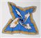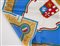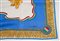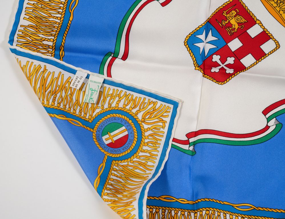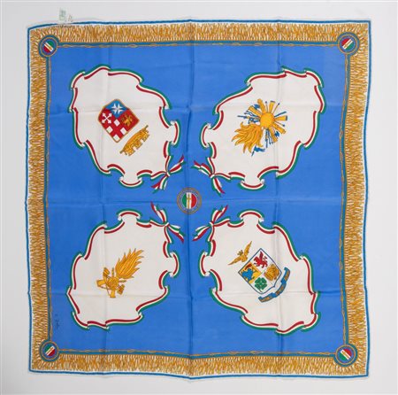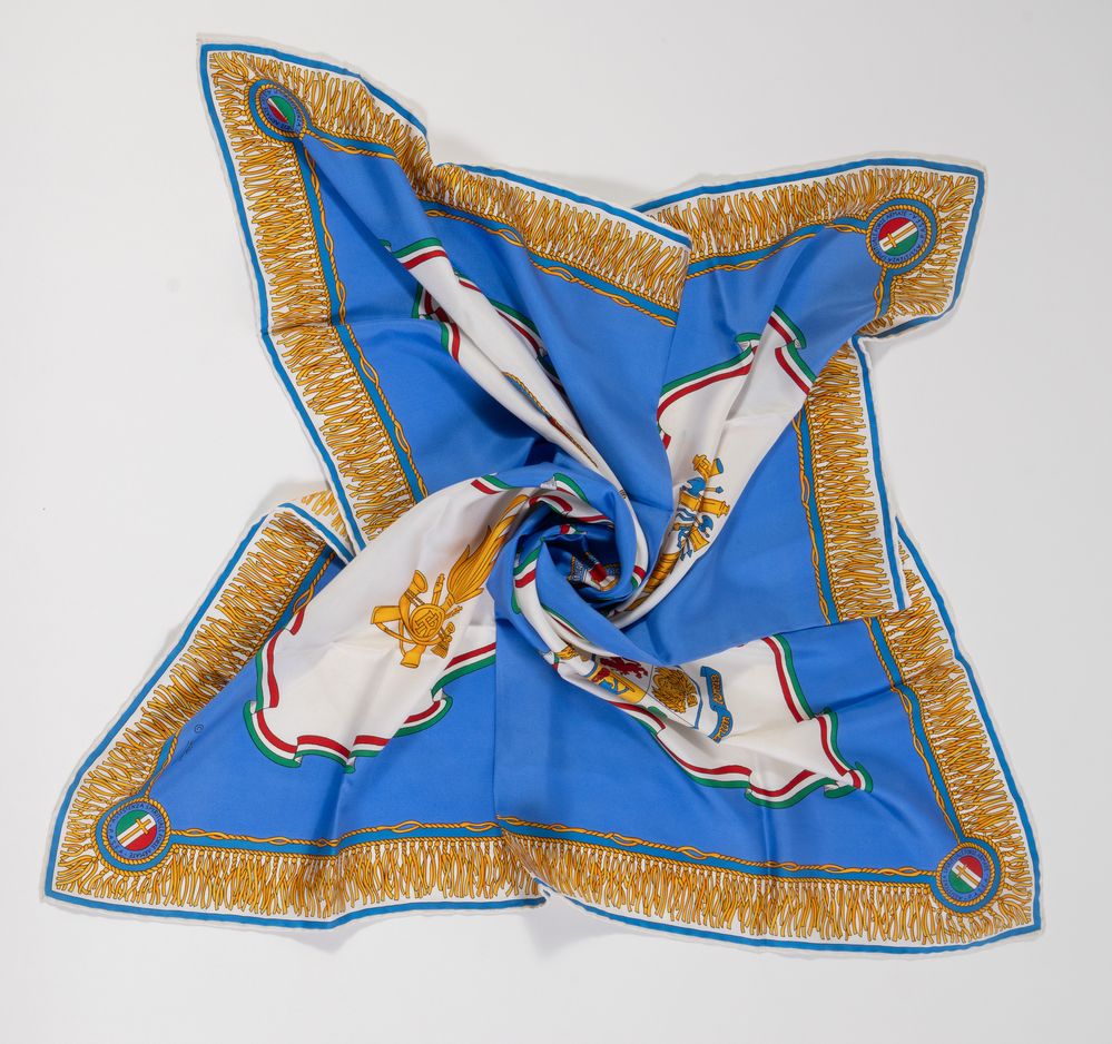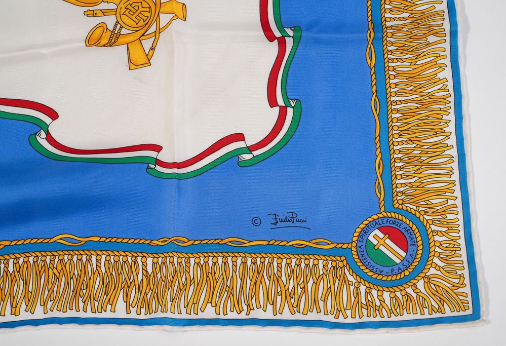 EMILIO PUCCI Foulard in seta sui toni del blu, giallo, bianco, rosso e verde con stampa celebrativa dell'Assistenza Spirituale Forse Armate P.A.S.F.A. Cm 91x91. Composizione 100% seta. Reca etichetta Emilio Pucci, Florence, Italy, Made in Italy e marchi Emilio. (difetti)