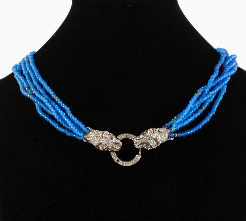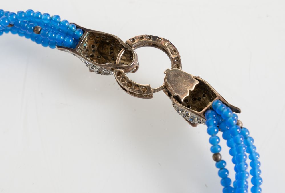 Collana a cinque fili di perline blu e argento con chiusura a forma di felino in argento 925 e zirconi. Lunghezza cm 54. Al retro reca punzone 925 e losanga locativa. (lievi mancanze)