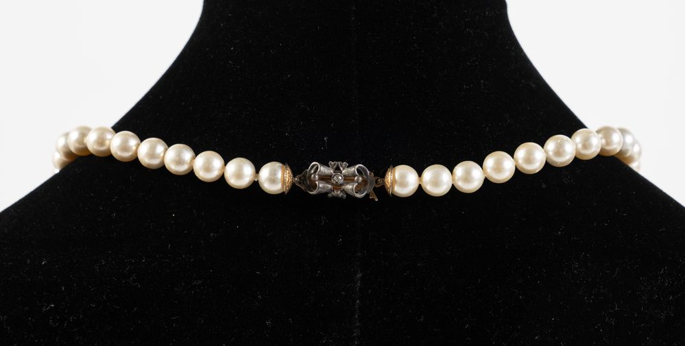 Collana di perle e pietre verdi con dettagli e chiusura in argento 925 con zirconi. Lunghezza cm 52. Reca punzone 925 e losanga locativa.